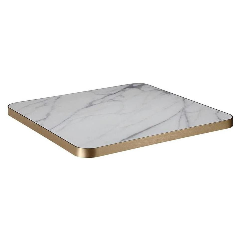 These 1-1/8" Dark Gray Veining Marbled Sintered Stone Outdoor Table Tops with Bronze Edge are commercial-grade and designed to last and look great in your foodservice location. These table tops works great for industrial or modern designs. Backed by our best price guarantee, these table tops will satisfy for years to come by offering style and durability.