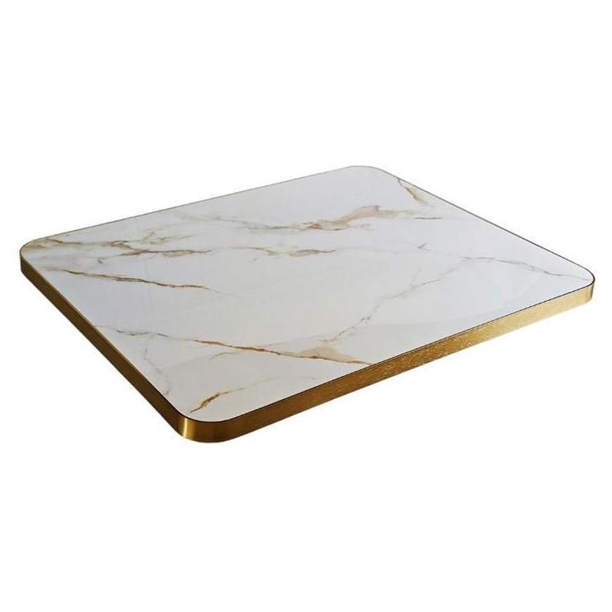 These 1-1/8" Gold Veining Marble White Sintered Stone Outdoor Table Tops with Gold Aluminum Edge are commercial-grade and designed to last and look great in your foodservice location. These table tops works great for industrial or modern designs. Backed by our best price guarantee, these table tops will satisfy for years to come by offering style and durability.