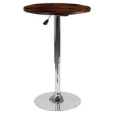 Whether you're hosting the holidays or need additional table space at your venue, this round adjustable height wood table will be your go to for any occasion. This multifunctional table boasts a swivel top and adjustable height pedestal frame that will make a spectacular statement piece in your venue. The height adjustable frame adapts from standard table height to counter height with the handle located under the top. The table has a narrow design so there is plenty of room for larger tables to be set up. The round, chrome base is out of the way when guests are socializing and adds a contemporary chic design. The base is fitted with a protective plastic ring, made to prevent your floor from being scratched. This table can be used as a standalone option or with the use of similarly designed adjustable height barstools with chrome base.