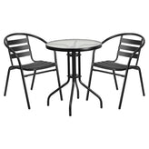 - 23.75'' Round Glass Metal Table with 2 Black Metal Aluminum Slat Stack Chairs