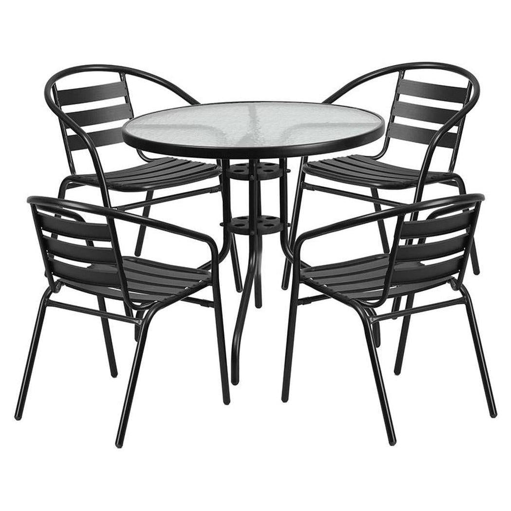 - 31.5'' Round Glass Metal Table with 4 Black Metal Aluminum Slat Stack Chairs