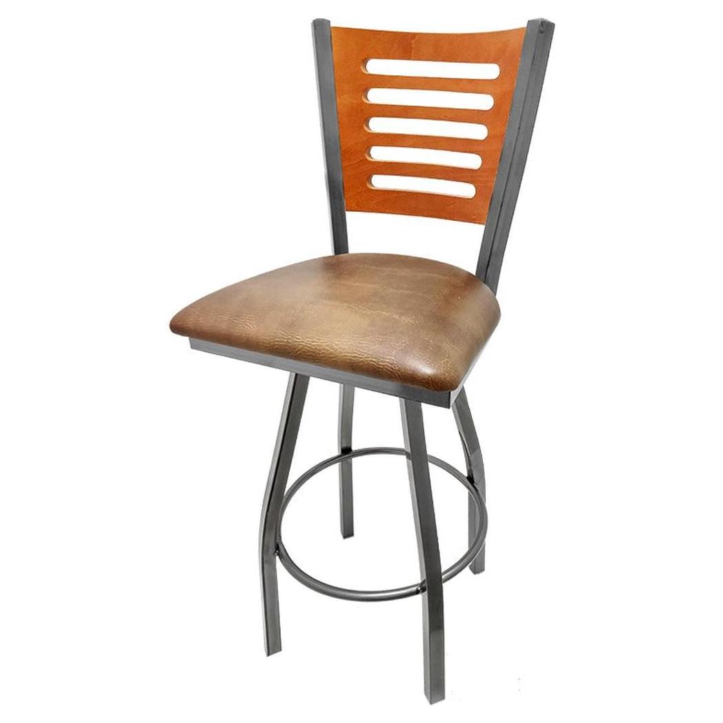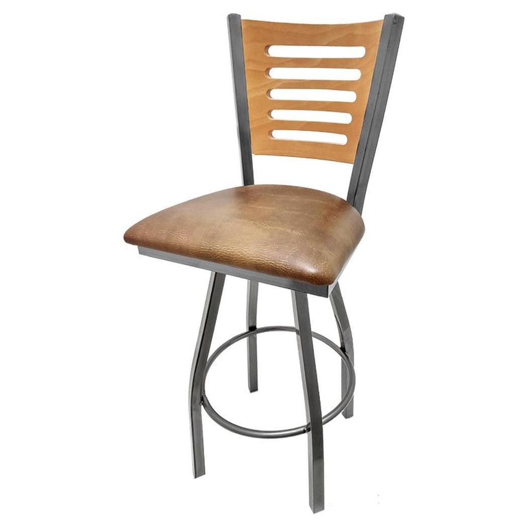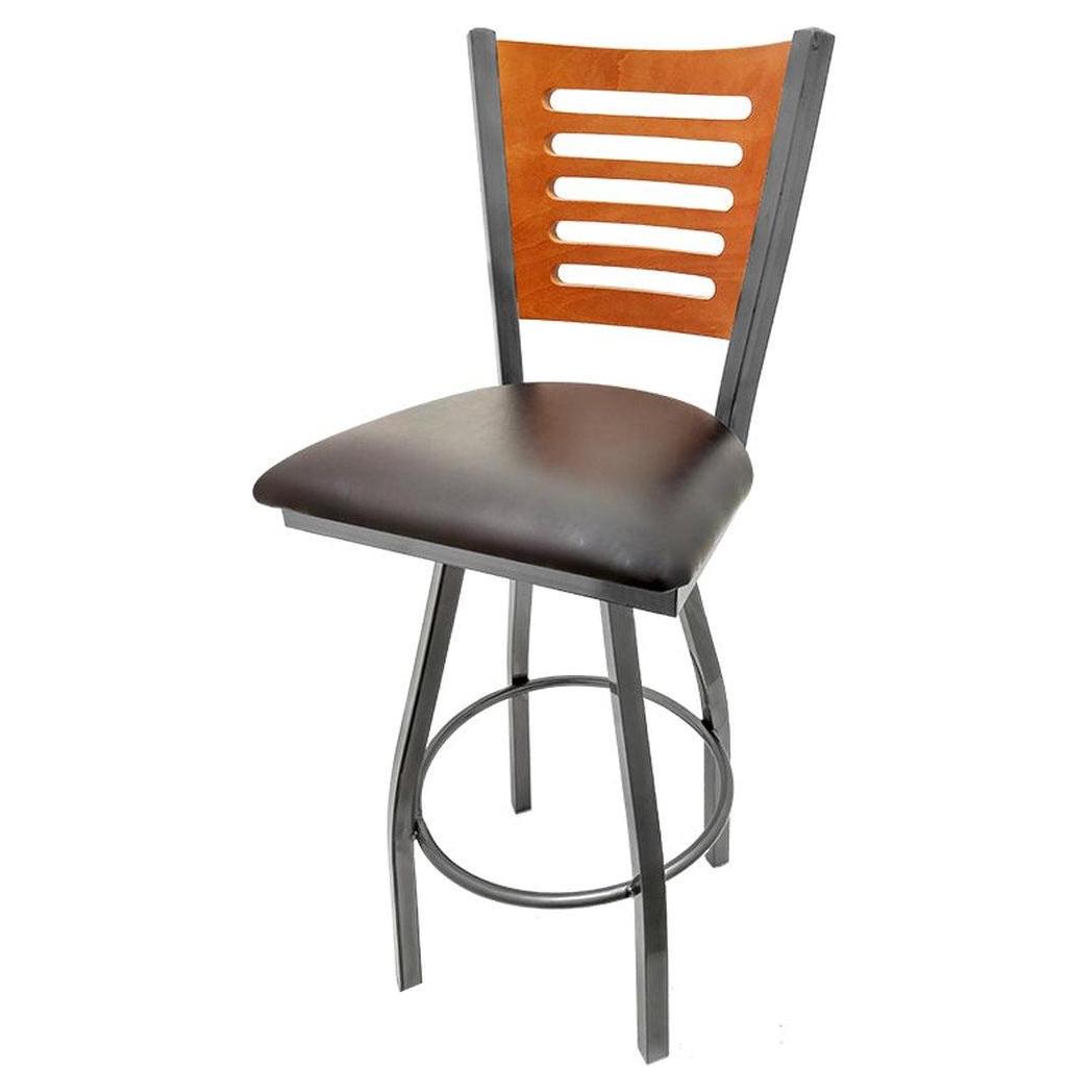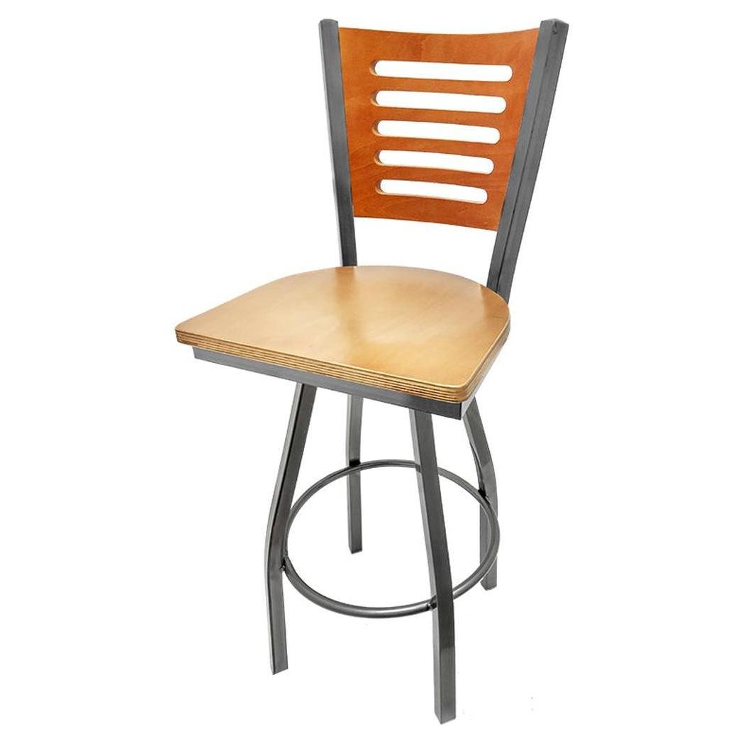 - 5 Line Wood Back Bar Stool with Clear Coat Swivel Base