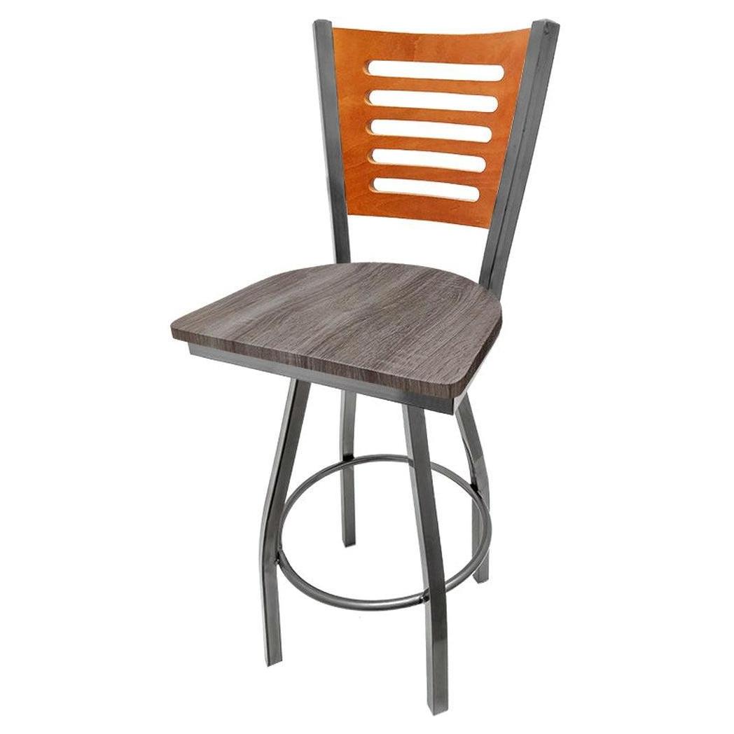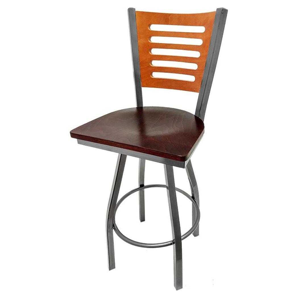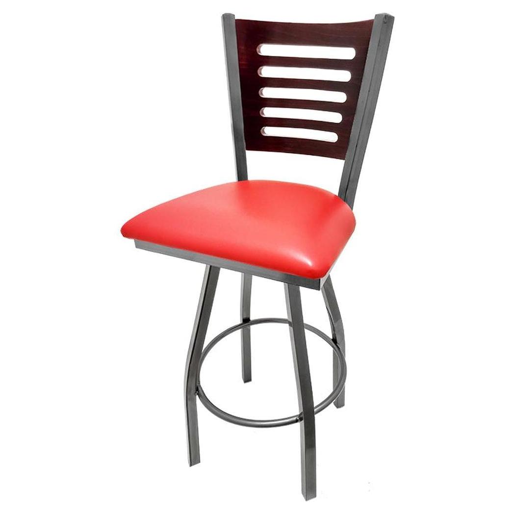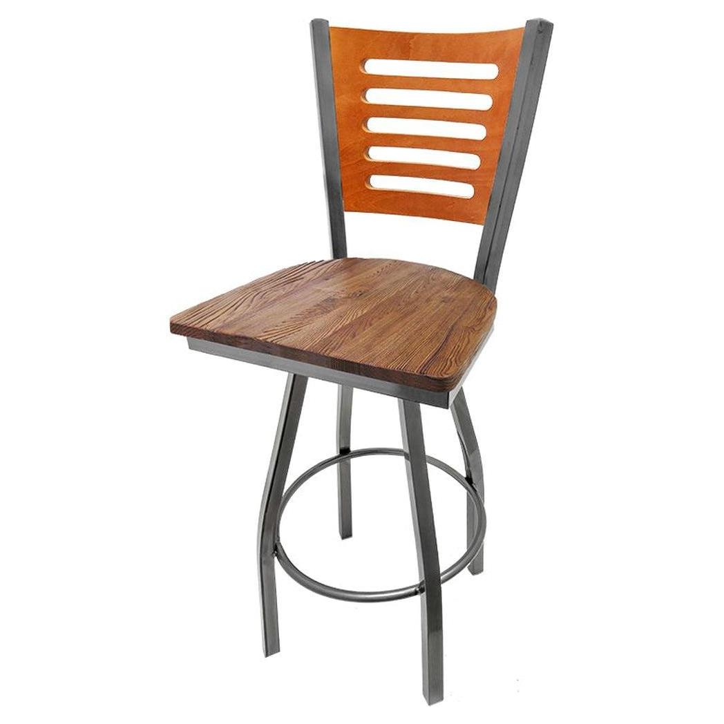 - 5 Line Wood Back Bar Stool with Clear Coat Swivel Base