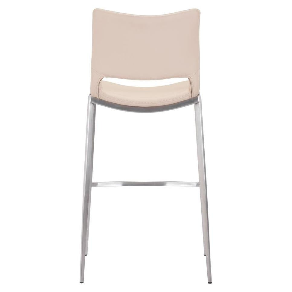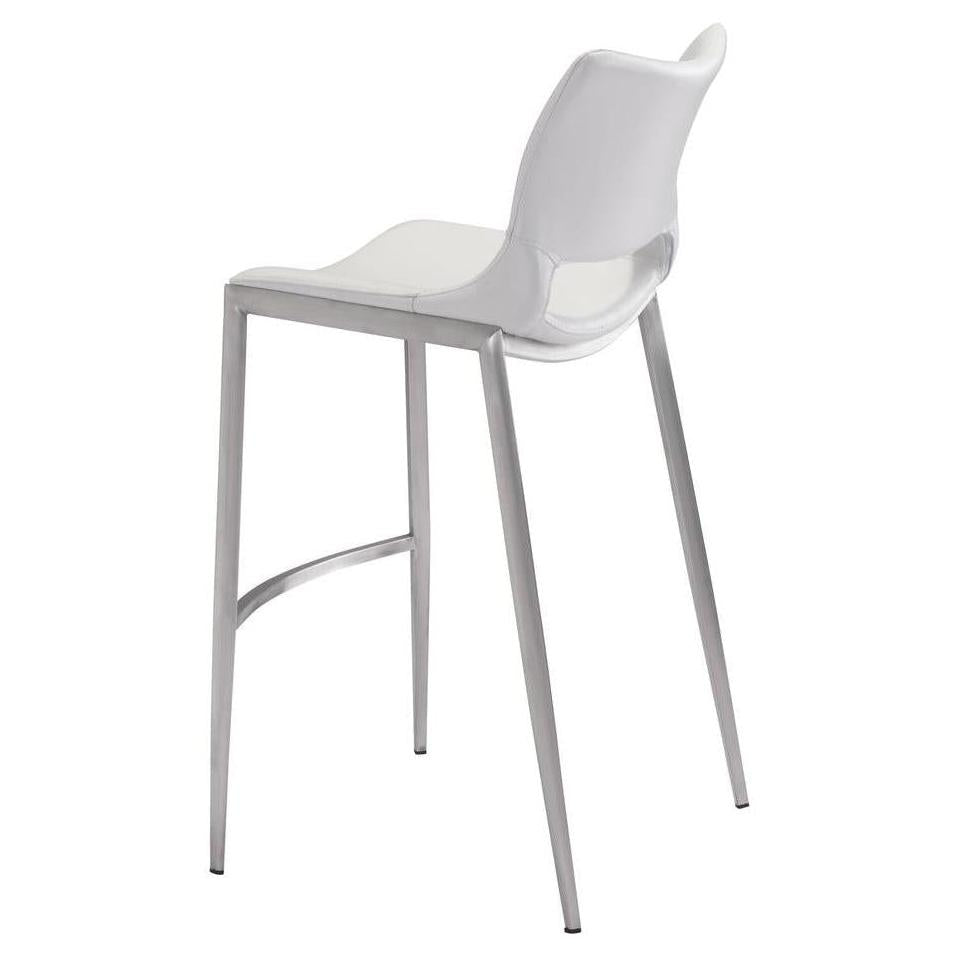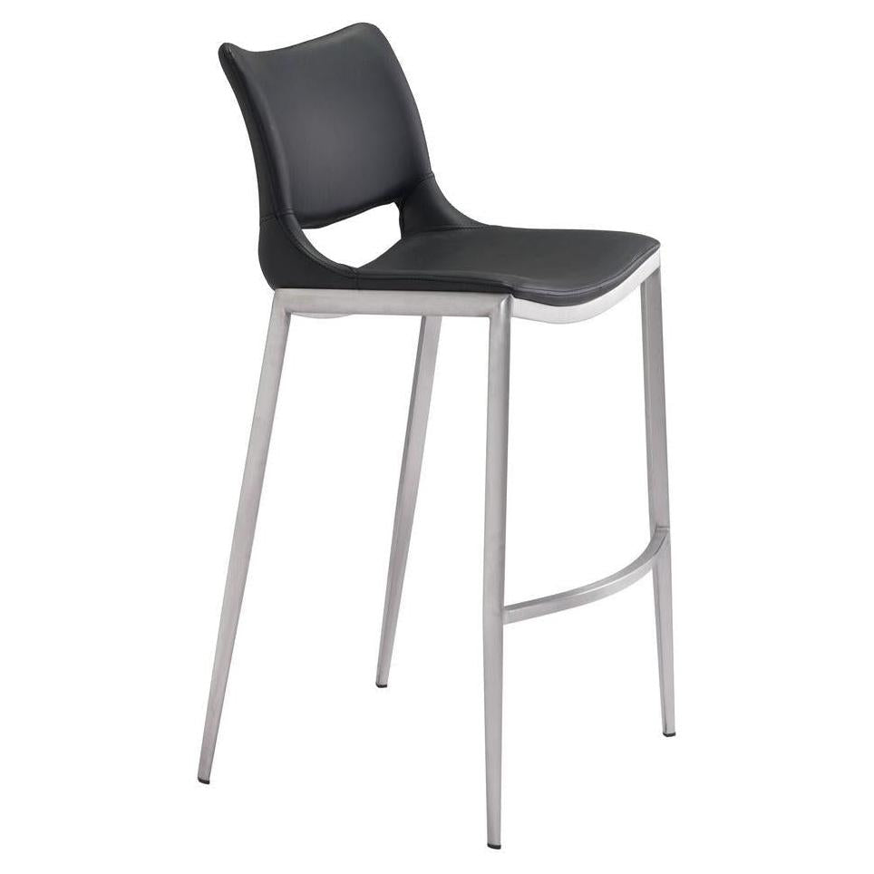 Built for comfort, this ergonomic bar chair is the perfect solution for your restaurant. A brushed stainless steel frame plays a supporting role while the built-in curved footrest keeps you firmly planted. Black faux leather seat deck is sleek and modern, making this bar chair the perfect compliment to any room setting. |