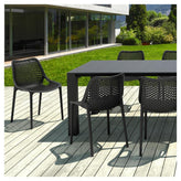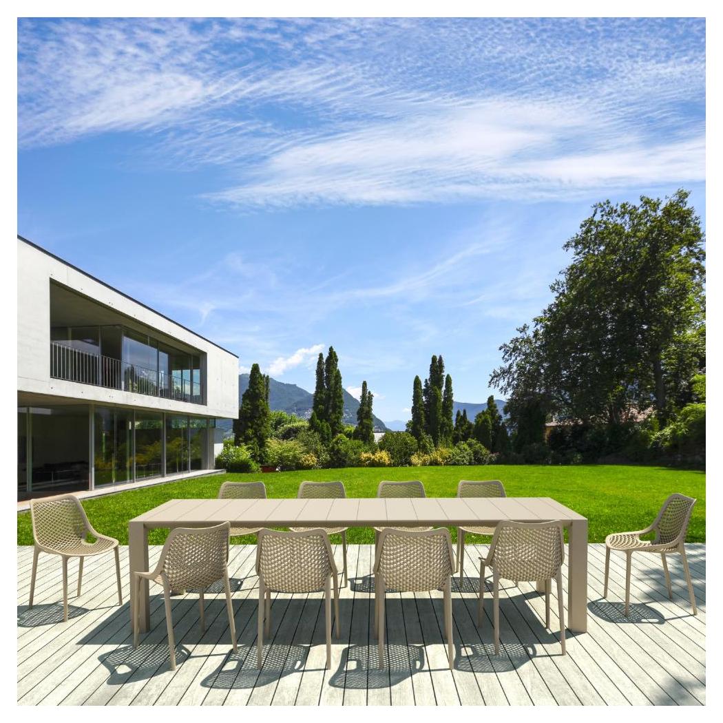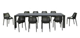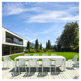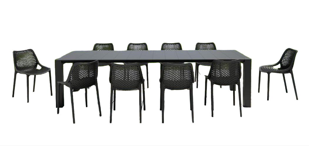 Air 11 piece dining set with 10 chairs and one extension table that extends from 102 inches to 118 inches. Chairs made from 100% recyclable resin polypropylene with gas injection molded legs. For indoor and outdoor use. Table practically extendable for accommodating more guests.UV resistant. Easy cleaning. Maintenance Free. Chairs are stackable. For outdoor use.