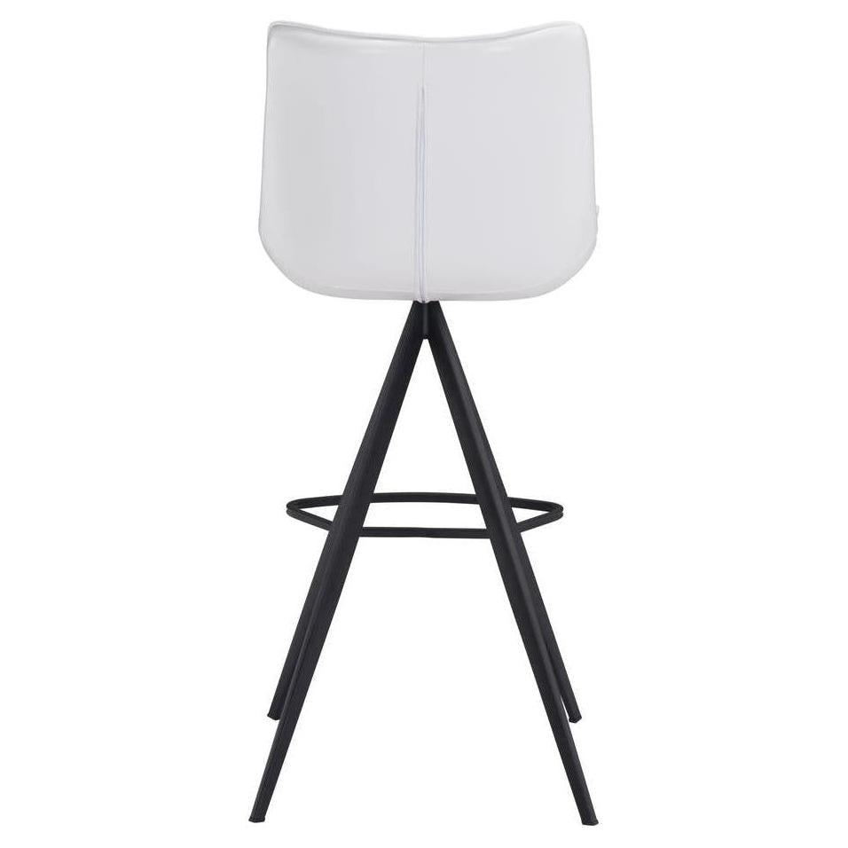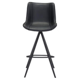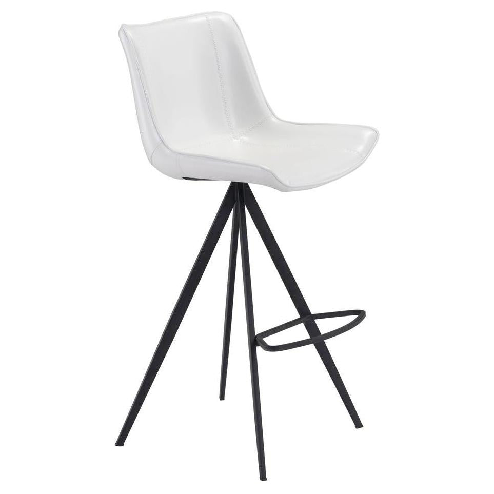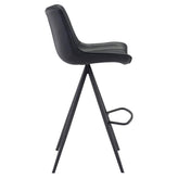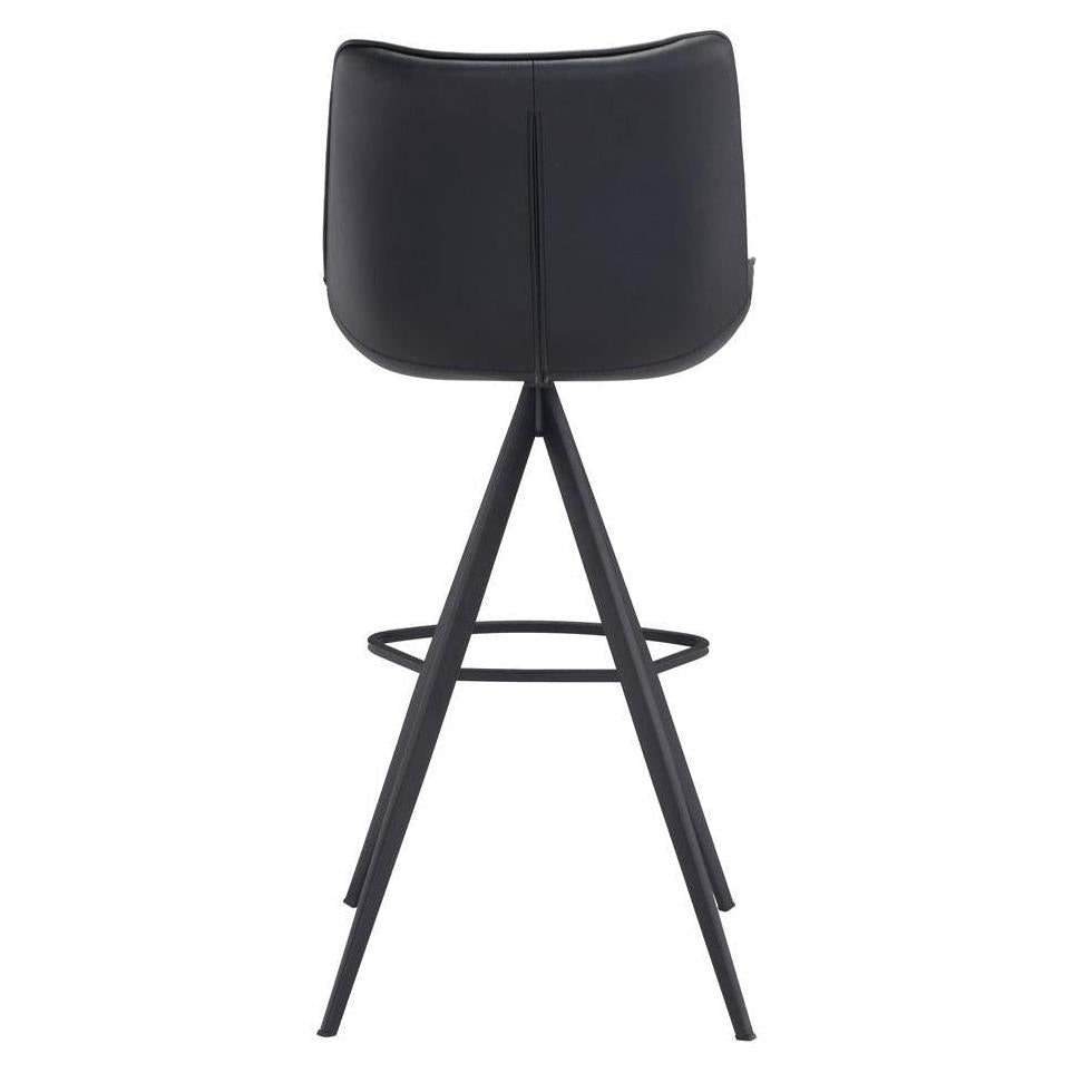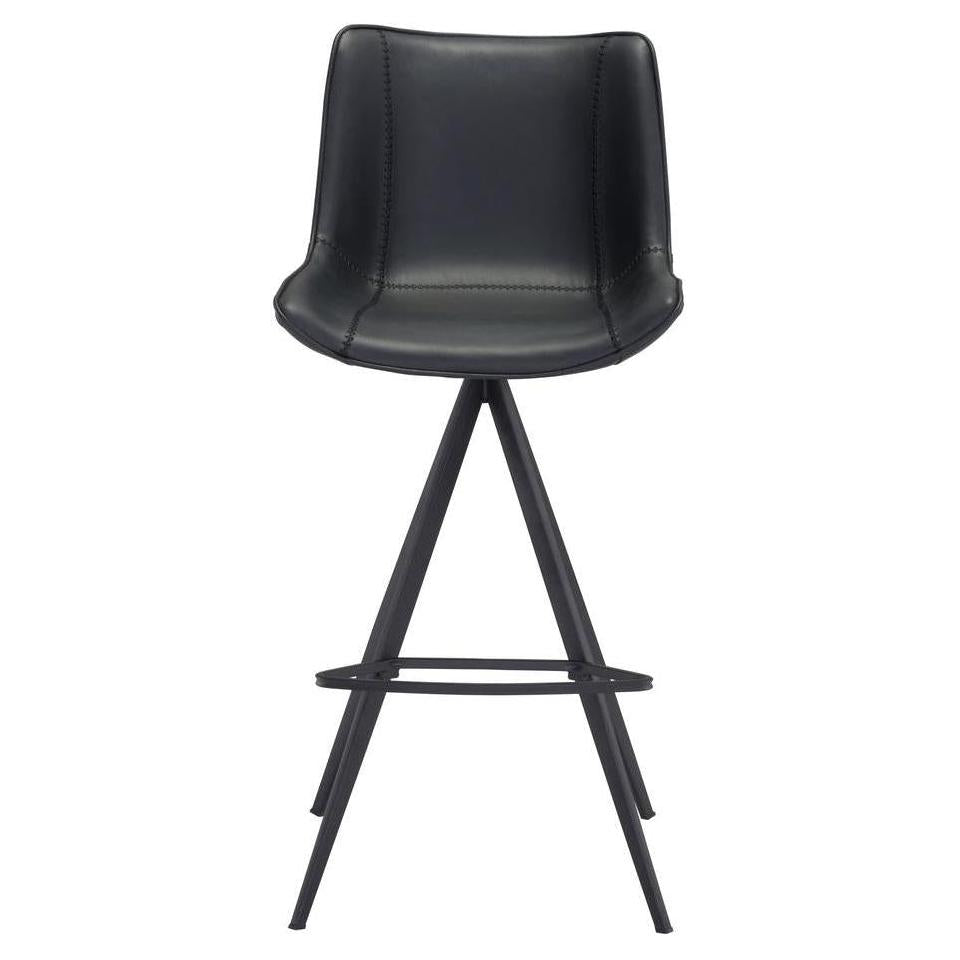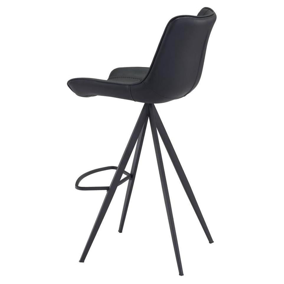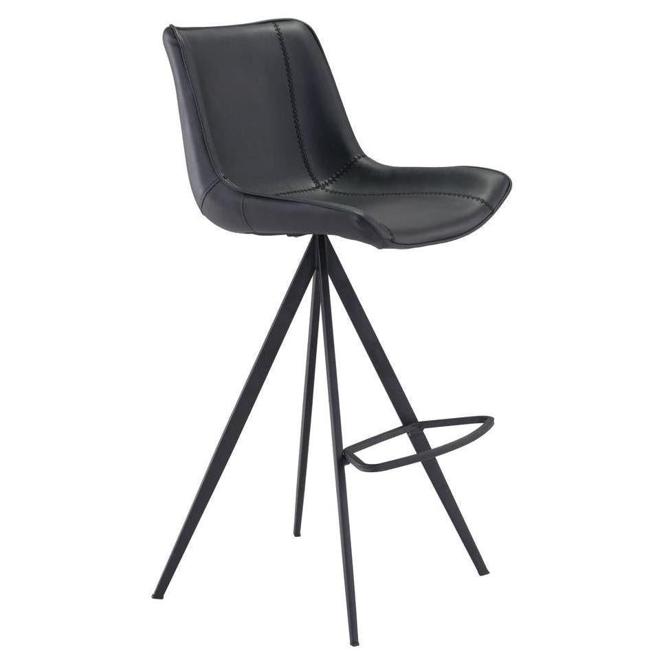 Handsome with the right amount of rugged, this bar chair is the perfect compliment to your restaurant. Its scooped seat in black faux leather rests on slim splayed legs in black with an attached footrest. Stitched detail gives it texture and dimension. Protective plastic feet keep your floors scratch-free.