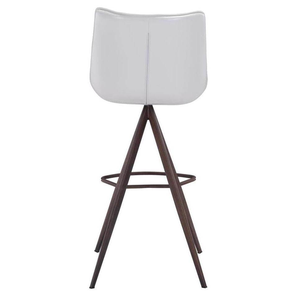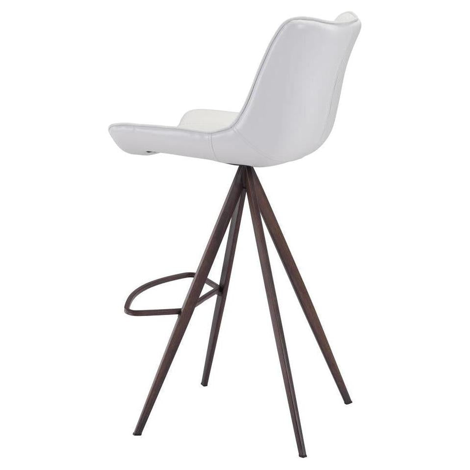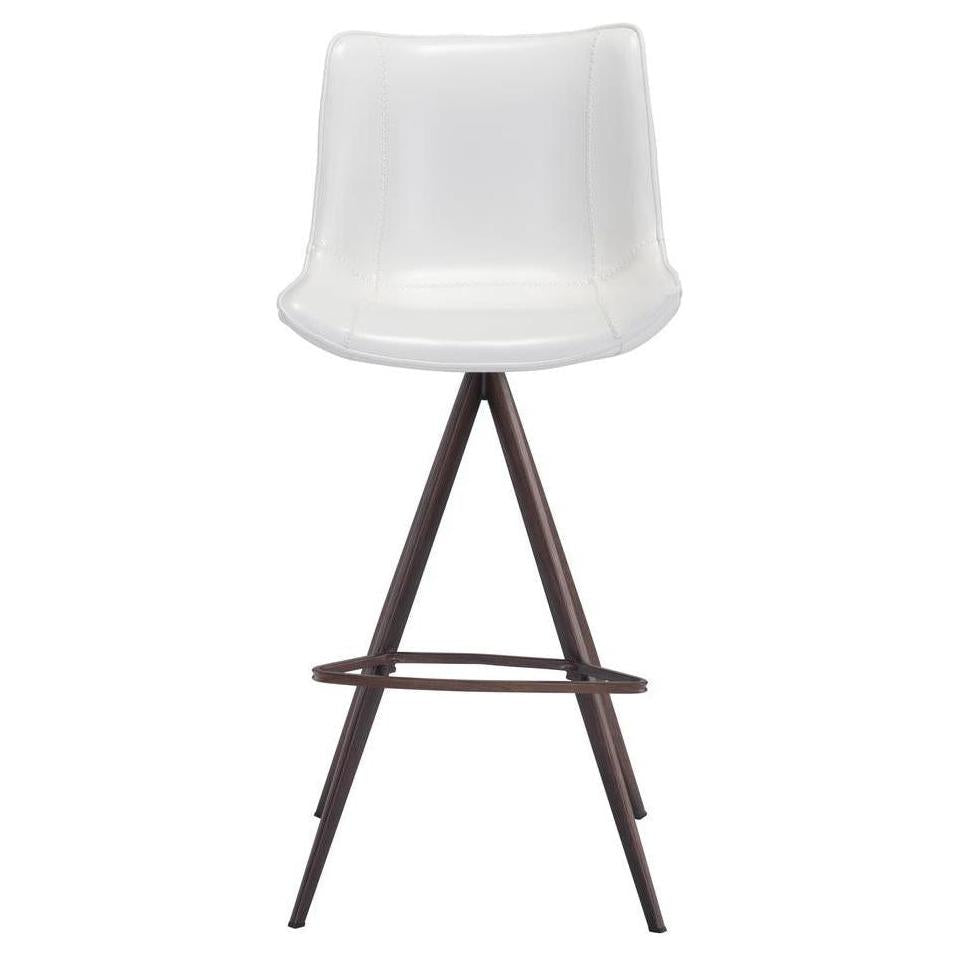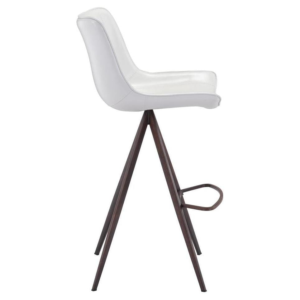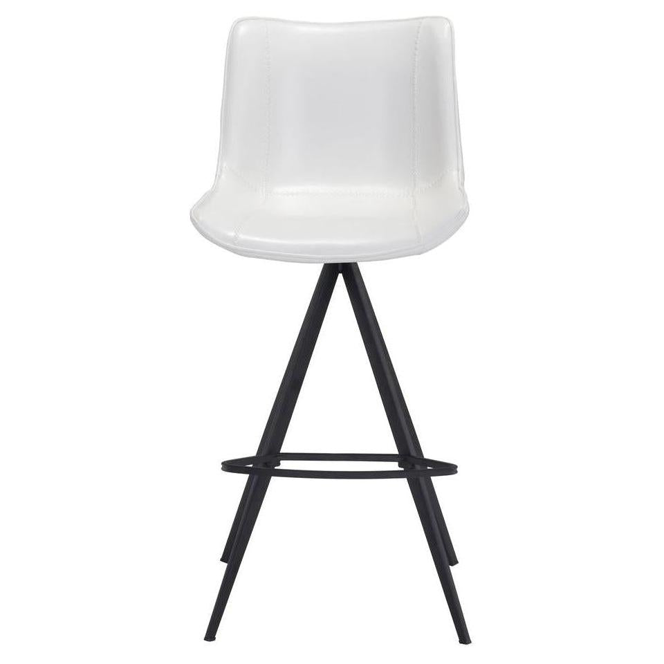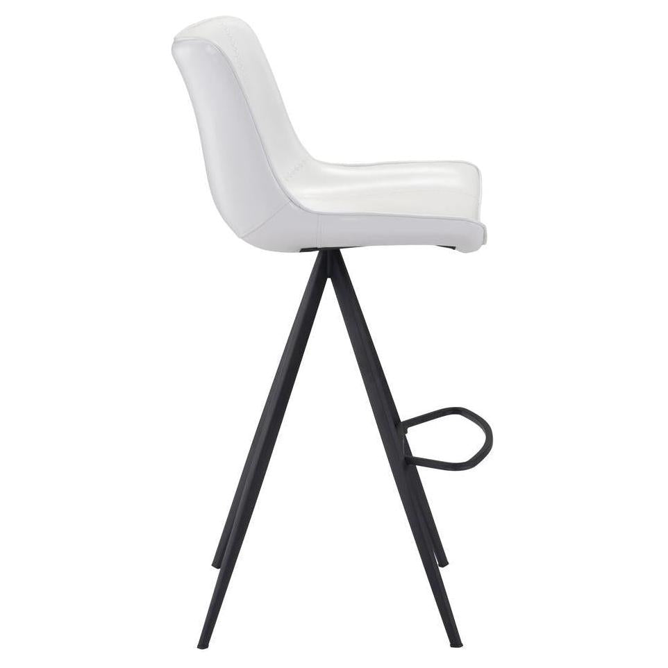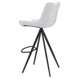Handsome with the right amount of rugged, this bar chair is the perfect compliment to your restaurant. Its scooped seat in black faux leather rests on slim splayed legs in black with an attached footrest. Stitched detail gives it texture and dimension. Protective plastic feet keep your floors scratch-free.