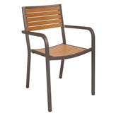 This aluminium Armchair with Imitation Teak Slats, Rust Color Frame is a commercial grade chair designed to last and look great in your restaurant. The chair fits in nicely for restaurants desiring a modern design. It is made of aluminium and is available in rust. This product is backed by our customer satisfaction return policy and our best price guarantee.