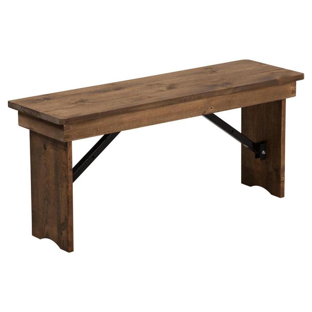 This Antique Rustic Solid Pine Folding Farm Bench is a commercial grade bench designed to last and look great in your food service location. This bench works great for rustic or traditional designs. It is made of metal, pine wood designed for the budget price point. This product is protected by our low price guarantee and our customer satisfaction return policy.