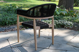 Antique Wash Eucalyptus & Black Rope Stacking Dining Chair is crafted from Eucalyptus Hardwood, Powder-Coated Aluminum Frames, Nautical-Grade Rope, Olefin Fabric for a warm, natural look suited for commercial and residential outdoor settings.