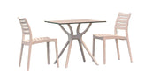 Outdoor dining set with two chairs and one square table. Made for commercial durability. Chairs are stackable. UV treated. Withstands outdoor temperatures summer and winter. Elegant and modern table has nonskid pads. Dining set is perfect for heavy use areas. Set items are 100% resistant to outdoors. Resin is virtually maintenance free. Table requires easy assembly. High quality commercial grade resin furniture - featuring refined designs, that are weatherproof, comfortable, and functional. Preferred for heavy use areas, pool sides, patios, beach and balcony use. Items are resistant to UV, salt, weather, sun tanning oils. |