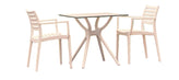 Outdoor dining set with two armchairs and one square table. Made for commercial durability. Chairs are stackable. UV treated. Withstands outdoor temperatures summer and winter. Elegant and modern table has nonskid pads. Dining set is perfect for heavy use areas. Set items are 100% resistant to outdoors. Resin is virtually maintenance free. Table requires easy assembly. High quality commercial grade resin furniture - featuring refined designs, that are weatherproof, comfortable, and functional. Preferred for heavy use areas, pool sides, patios, beach and balcony use. Items are resistant to UV, salt, weather, sun tanning oils. |