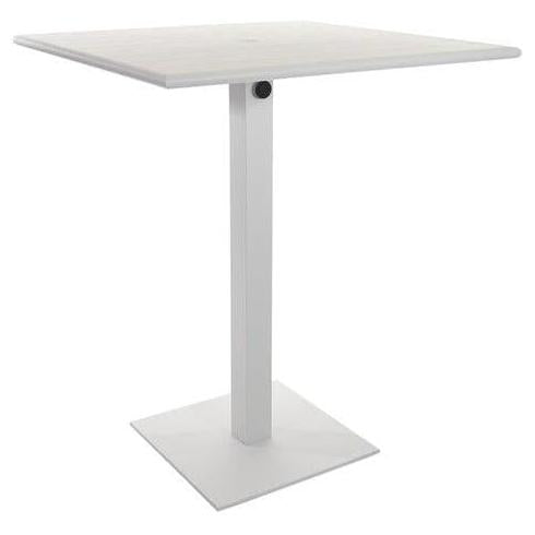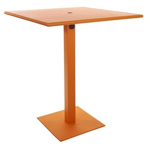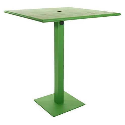This sleek, outdoor bar height table features a modern design. It is available in white, berry, lime, and citrus powder coat finishes. It has a slatted surface that allows rain to drain & is sold complete with matching base. Umbrella hole & Margate base umbrella compatible, 32" x 48" use Bali end bases with optional weighted umbrella base required (#UB50RD). It also has adjustable glides. It ships knocked down and requires assembly. It comes with a one-year manufacturer's warranty and our best price guarantee.