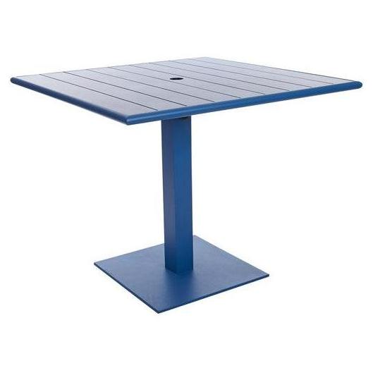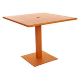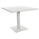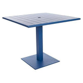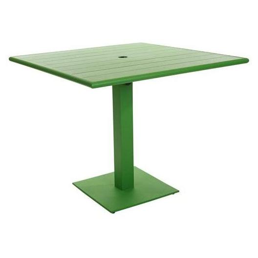 This sleek, outdoor dining height table features a modern design. It is available in white, berry, lime, and citrus powder coat finishes. It has a slatted surface that allows rain to drain & is sold complete with matching base. Umbrella hole & margate base umbrella compatible, 32"x 48" use Bali end bases with optional weighted umbrella base required (#UB50RD). It also has adjustable glides. It ships knocked down with assembly required. It comes with a one-year manufacturer's warranty and our best price guarantee.