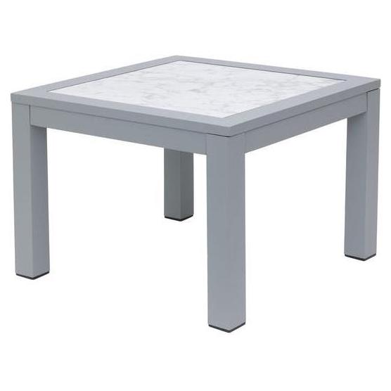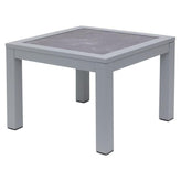 This sleek, outdoor end table top features a modern design. It is available in black and soft gray poder coat finishes. It features a compact laminate inlay of either Carrara or Pietro marble. It ships knocked down and requires assembly. It comes with a one-year manufacturer's warranty and our best price guarantee.