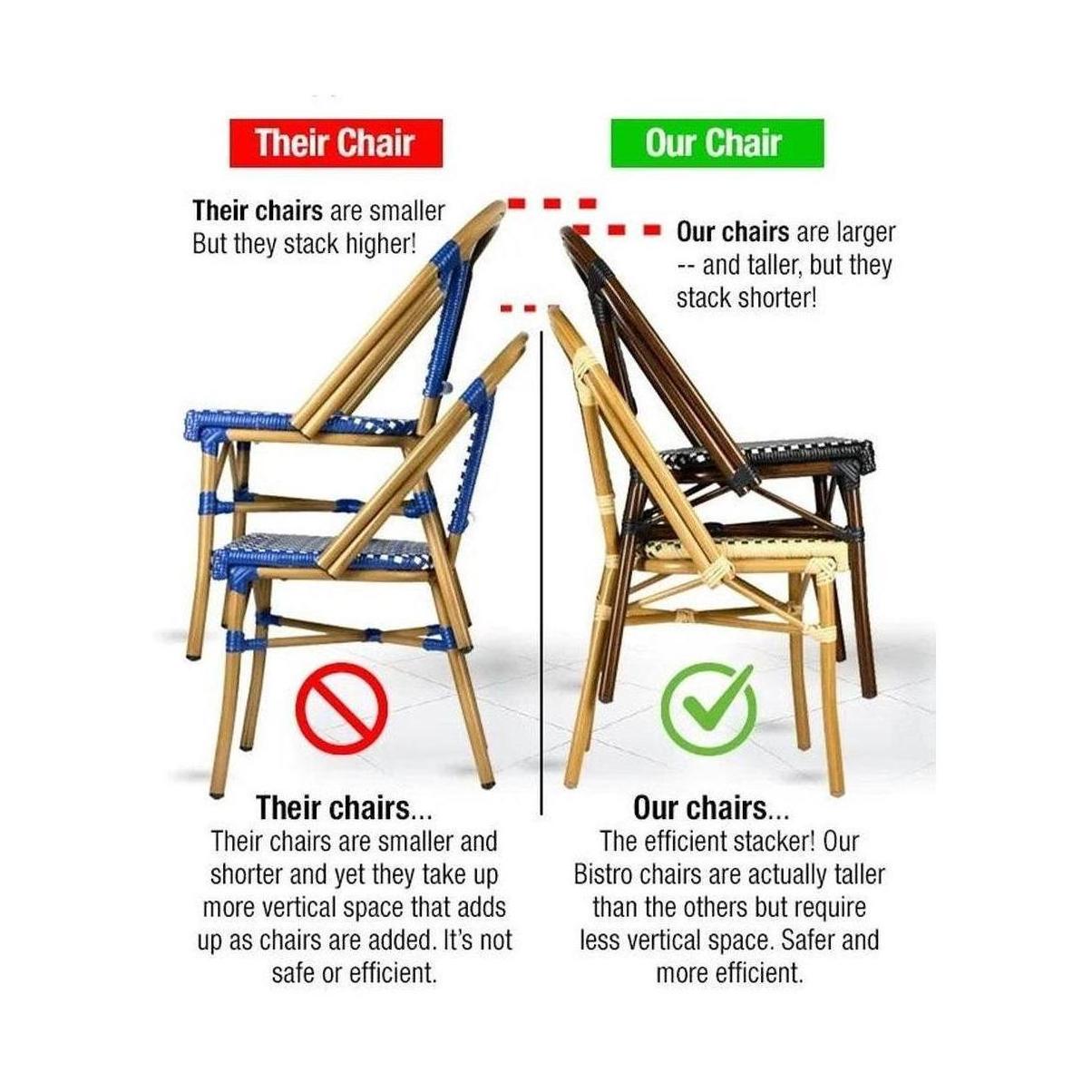 Discover the perfect blend of style and durability with our bistro chair. Our Hand Woven Wicker Rattan chairs offer timeless charm and unbeatable durability for outdoor settings. Withstanding rain, snow, UV light, and more, these chairs, paired with welded aluminum frames, ensure both style and resilience.