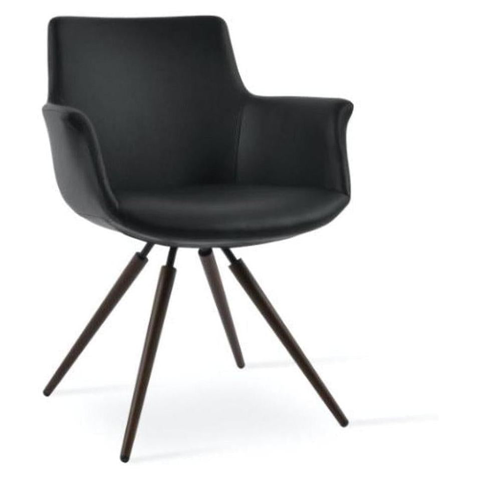 Bottega Carrot Swivel is a unique dining chair with a comfortable upholstered seat and backrest on carrot swivel steel base available in various of different base options. Each leg is tipped with a plastic glide screwed into the foot. The seat has a steel structure with shape springs for extra flexibility and strength. This steel frame is molded by an injecting polyurethane foam. Bottega seat is upholstered with a removable zipper enclosed leather, PPM, or wool fabric slip cover. This contemporary chair is suitable for both residential and commercial use.