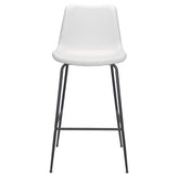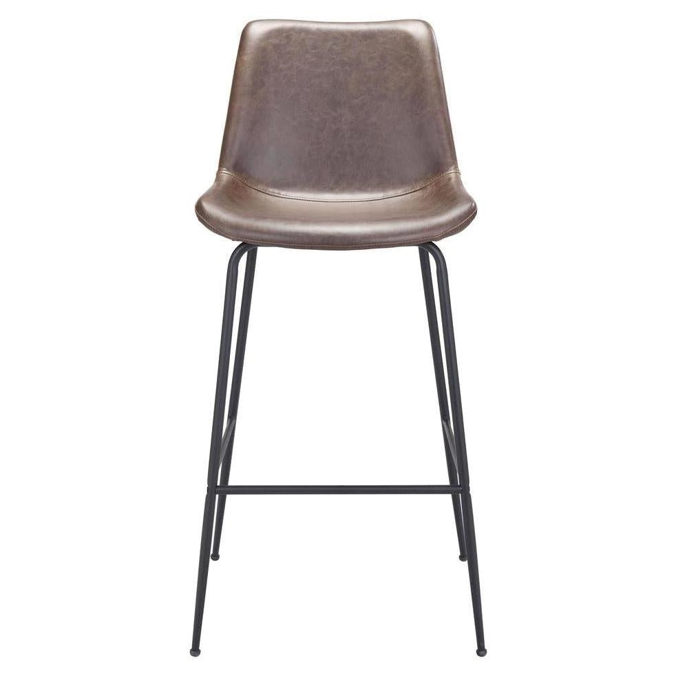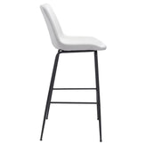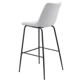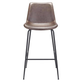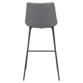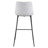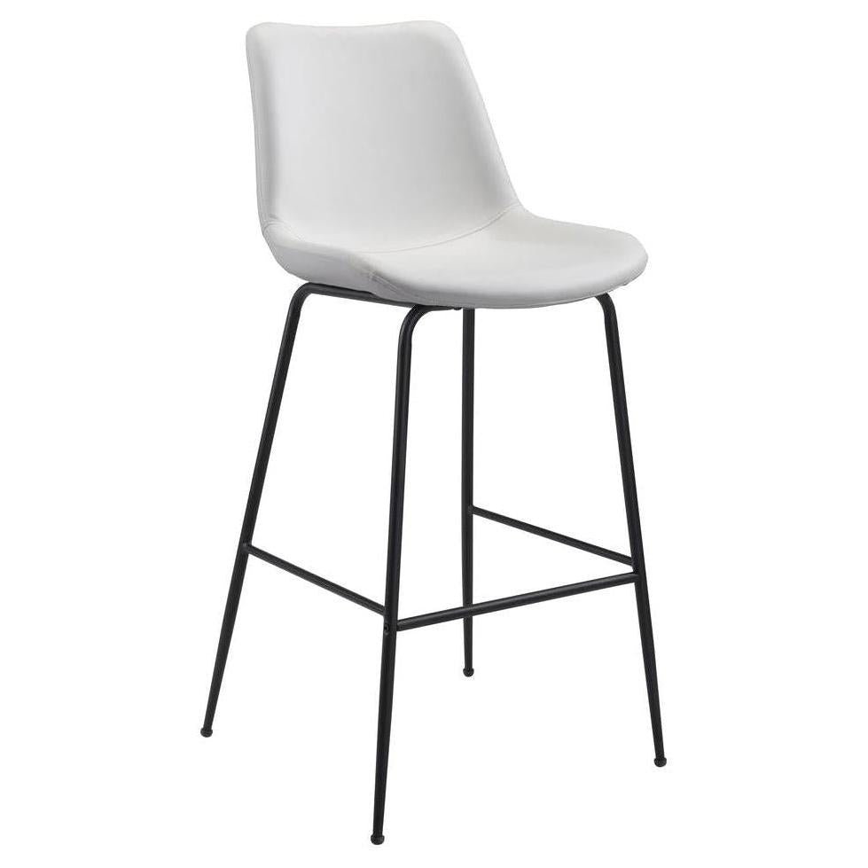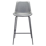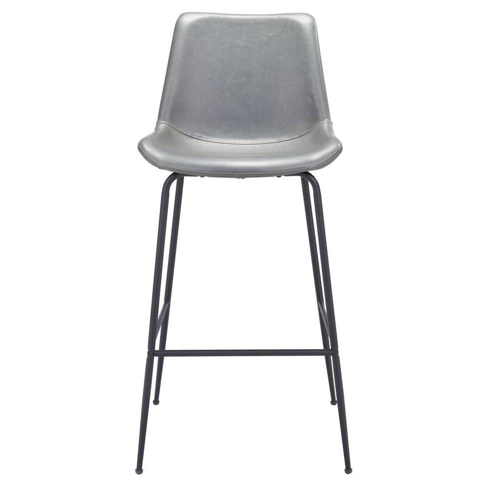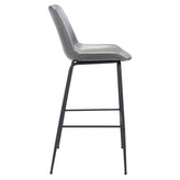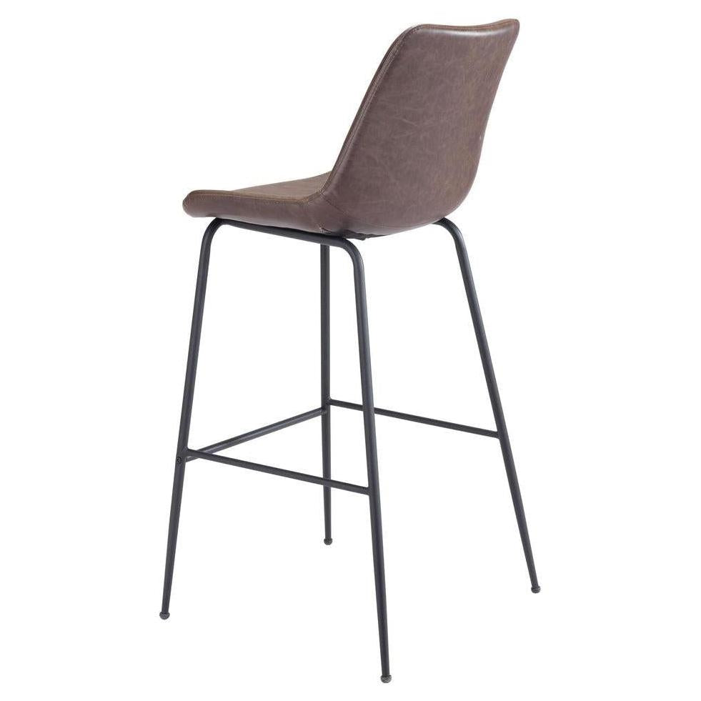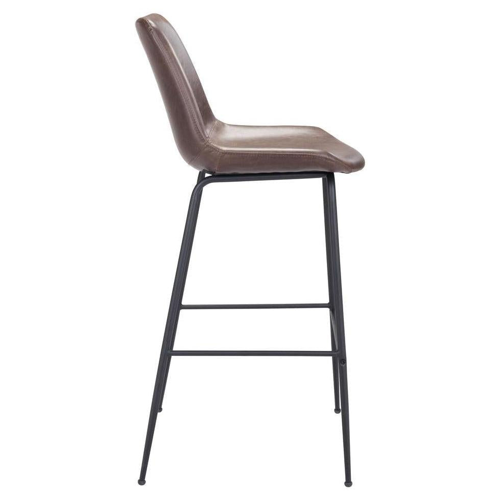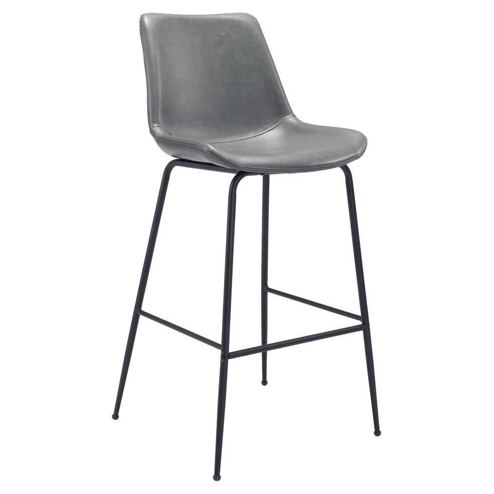 | The Bryon Bar Chair has mid century modern urban lines and looks great in any space. With a heavy duty vinyl covering and a sturdy steel frame, this bar chair fits in any home kitchen, dining area, or bar. The legs are finished in a matte black coating that is durable for hospitality use. | |