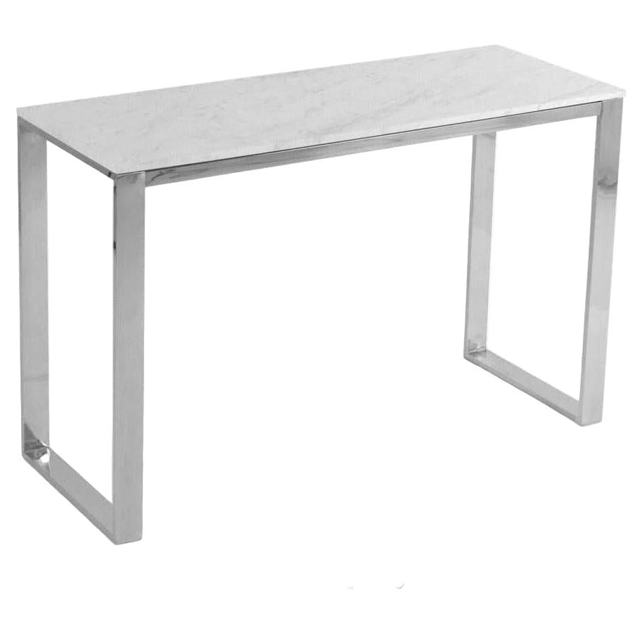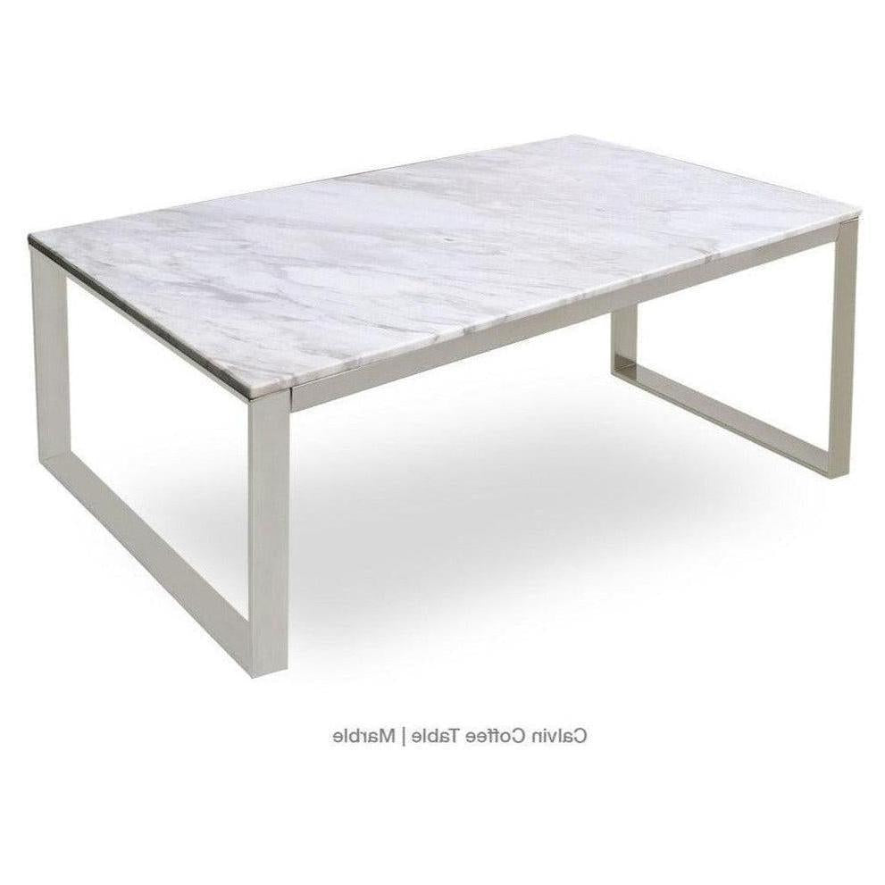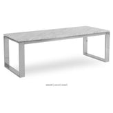 Calvin Marble rectilinear lines are maintained throughout the entire concept to result in a highly polished perfectionism. Marble top is attached to the two polished metal frames on each end via UV bonded plates to maintain stability and style. Every table top is made out of natural stone and therefore each top is different and unique. Variations of color are inherent to the natural stone and considered part of the top's beauty.