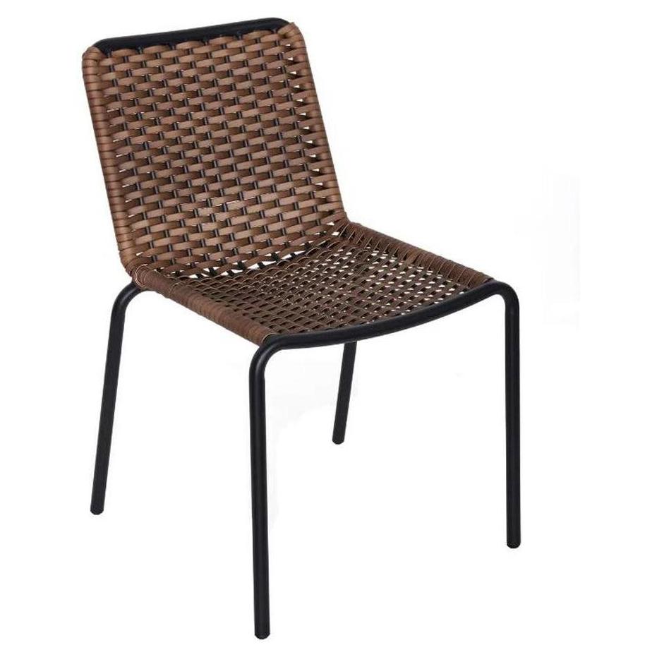 with durable woven synthetic rope seat and back. Available in stacking side and armchair, and non-stacking armless barstool. White or black frame.