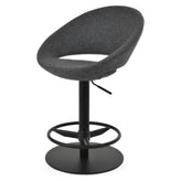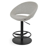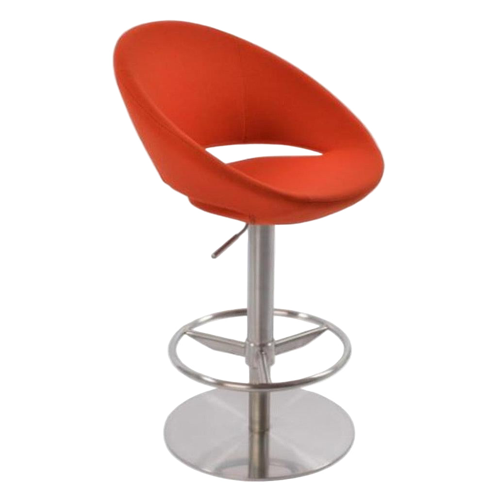 Crescent Piston Full Footrest is a contemporary stool with a comfortable upholstered seat and backrest on an adjustable gas piston base which swivels and also adjusts easily from a counter height to a bar height with a lever that activates the gas piston mechanism. The solid steel round base is available in chrome or stainless steel. The seat has a steel structure with shape springs for extra flexibility and strength. This steel frame molded by injecting polyurethane foam. Crescent seat is upholstered with a removable zipper enclosed leather, PPM, or wool fabric slip cover. The stool is suitable for both residential and commercial use.