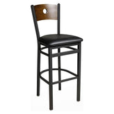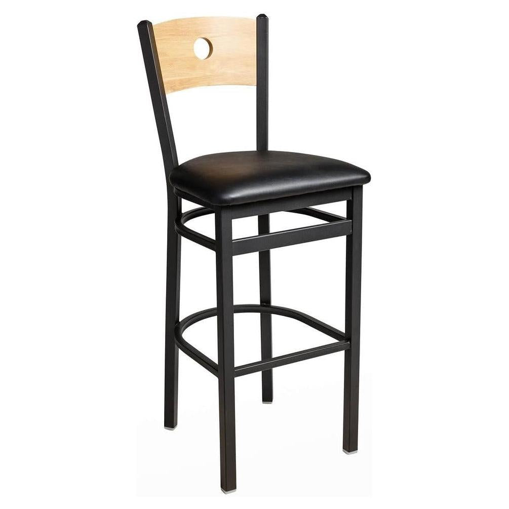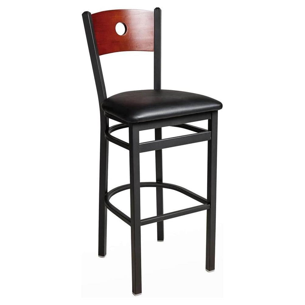 This modern Darby Circle Wood Back Bar Stool features a classic design. It is available in sand black powder coat finish. Upgraded upholstery options available. It comes with a one-year manufacturer's warranty and our best price guarantee.