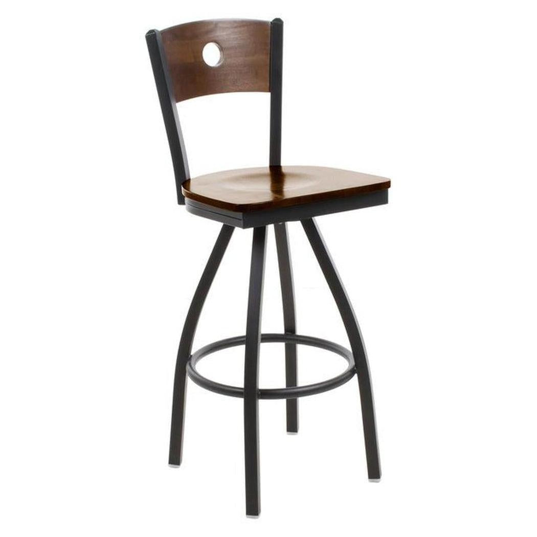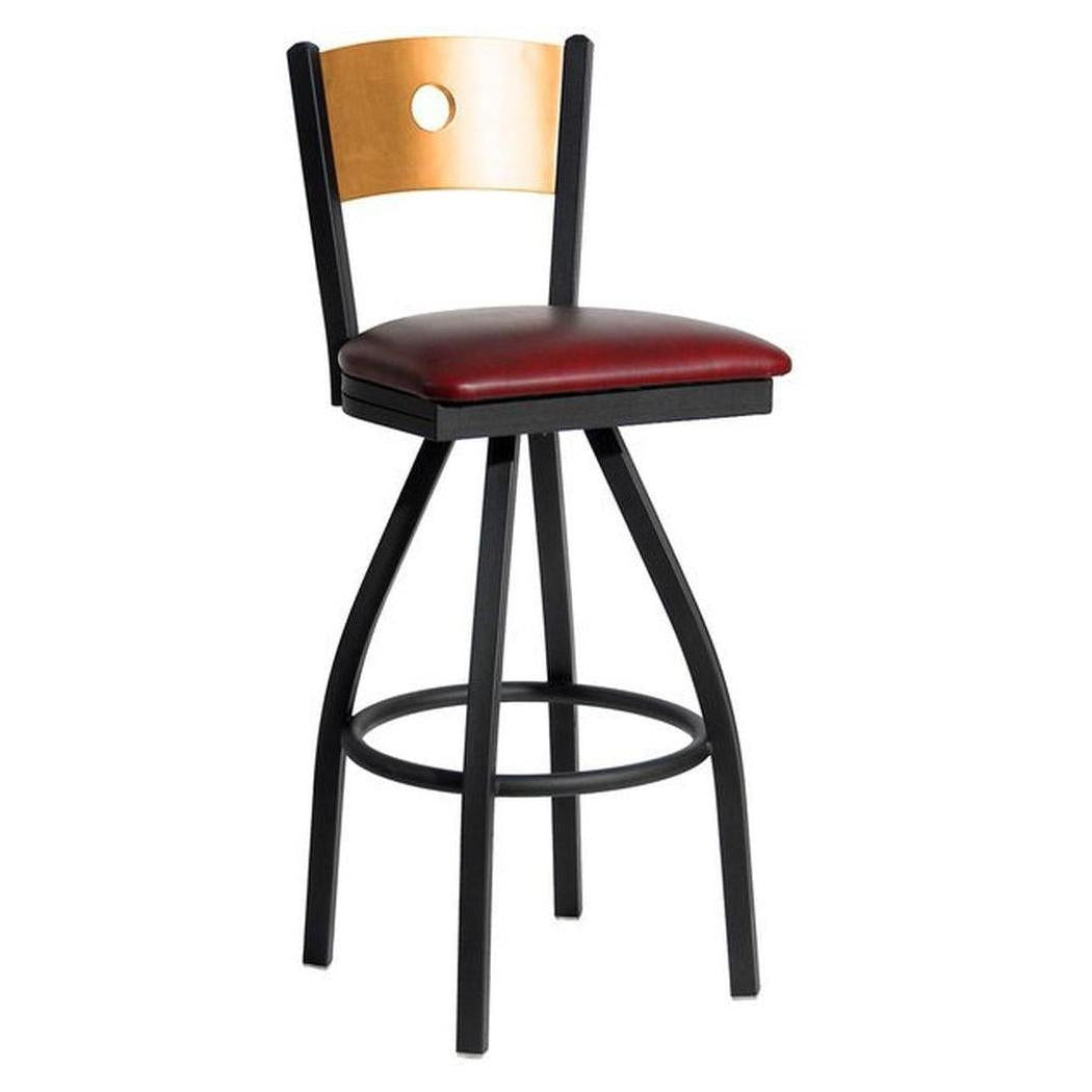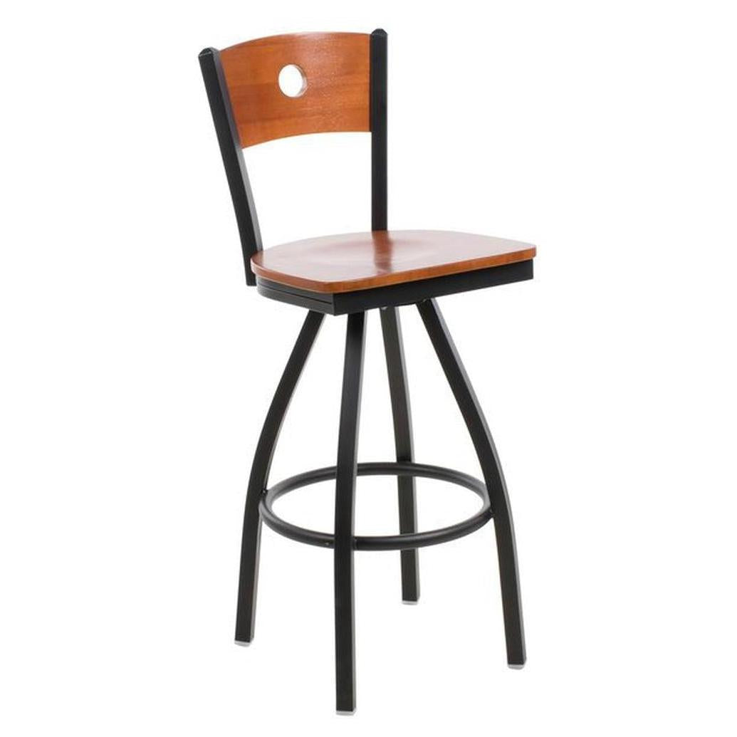 This modern Darby Circle Wood Back Swivel Bar Stool features a classic design. It is available in sand black powder coat finish. Upgraded upholstery options available. It comes with a one-year manufacturer's warranty and our best price guarantee.