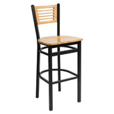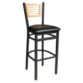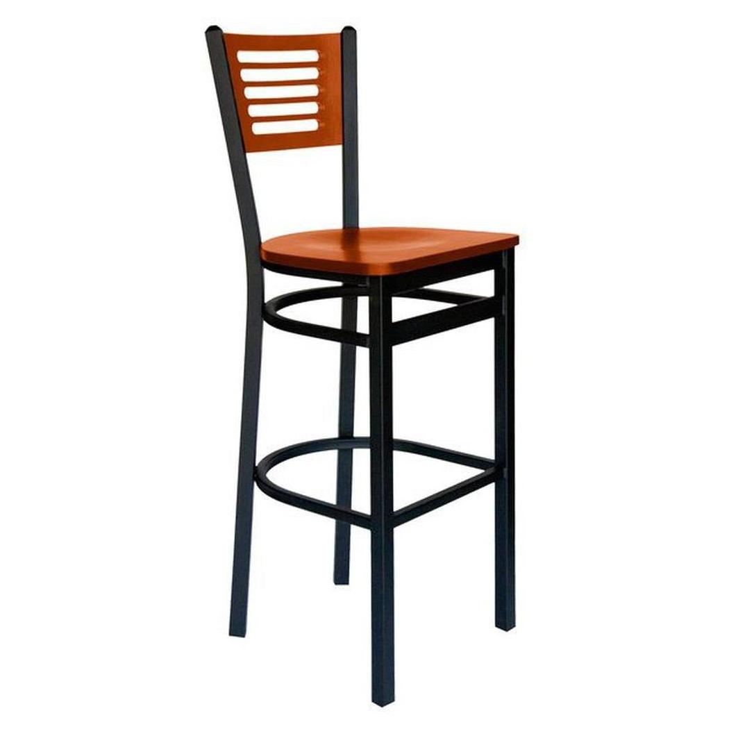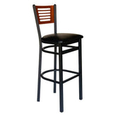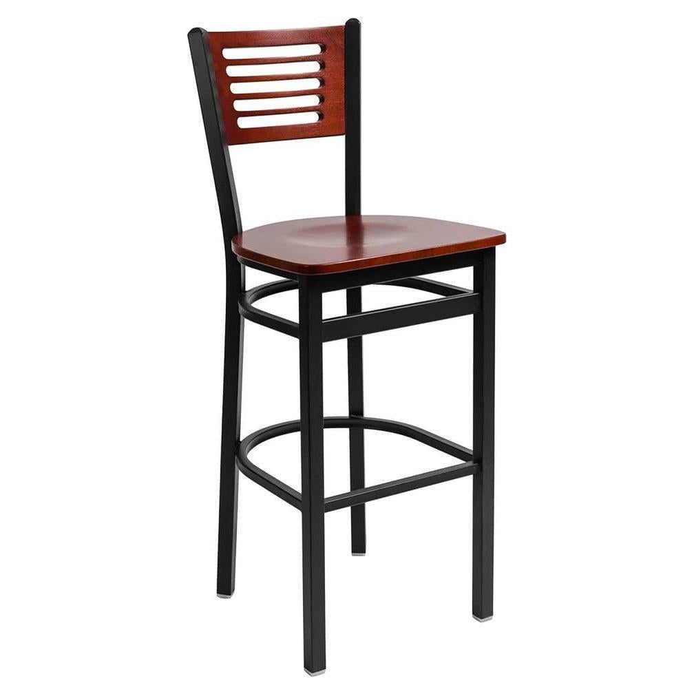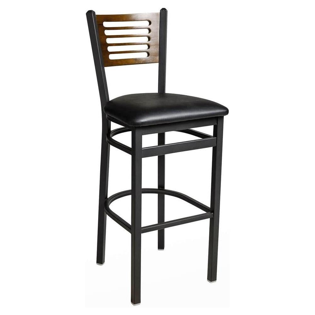 This modern Espy Slotted Wood Back Bar Stool features a classic design. It is available in sand black powder coat finish. Upgraded upholstery options available. It comes with a one-year manufacturer's warranty and our best price guarantee.
