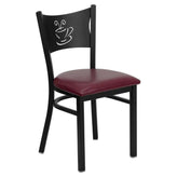 Be a trendsetter and offer guests a seating option that is a little different but a lot of charming. This appealing metal restaurant chair boasts a coffee back design and black vinyl upholstered seat that give this piece something extra and is a nice change of pace. The durable frame is stabilized with welded joint assembly and curved support bar that does well in high traffic establishments. This metal chair is easy to clean, which is an important aspect when it comes to a business. This chair was designed to withstand the daily rigors in the hospitality industry, but will also provide a chic, engaging look to your home. Floor glides help protect your floors and ensure smooth gliding. The simple and lightweight design of this chair is perfect for both residential or commercial grade use.