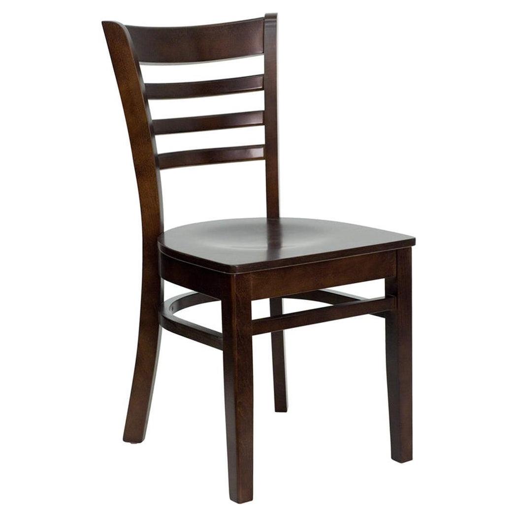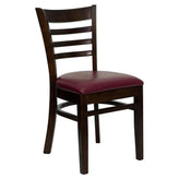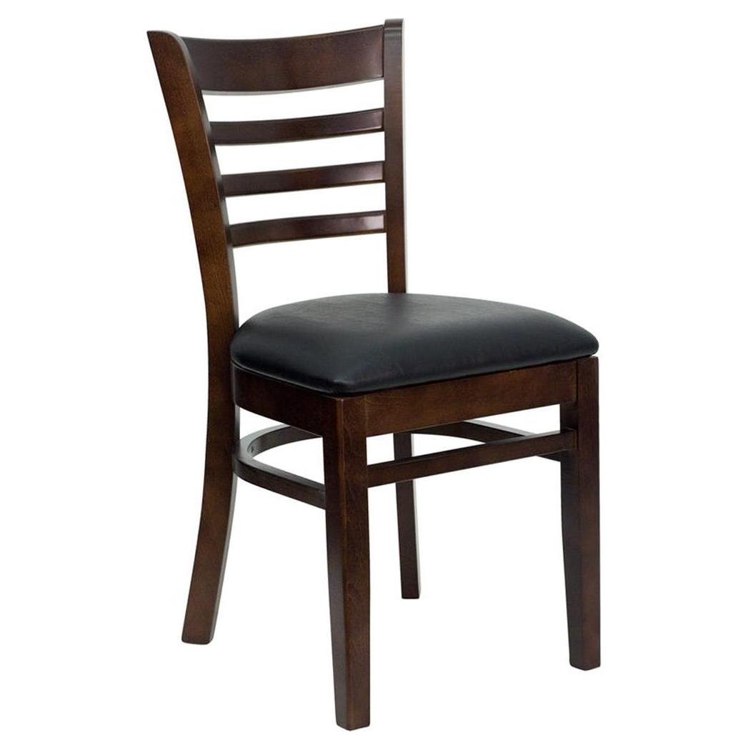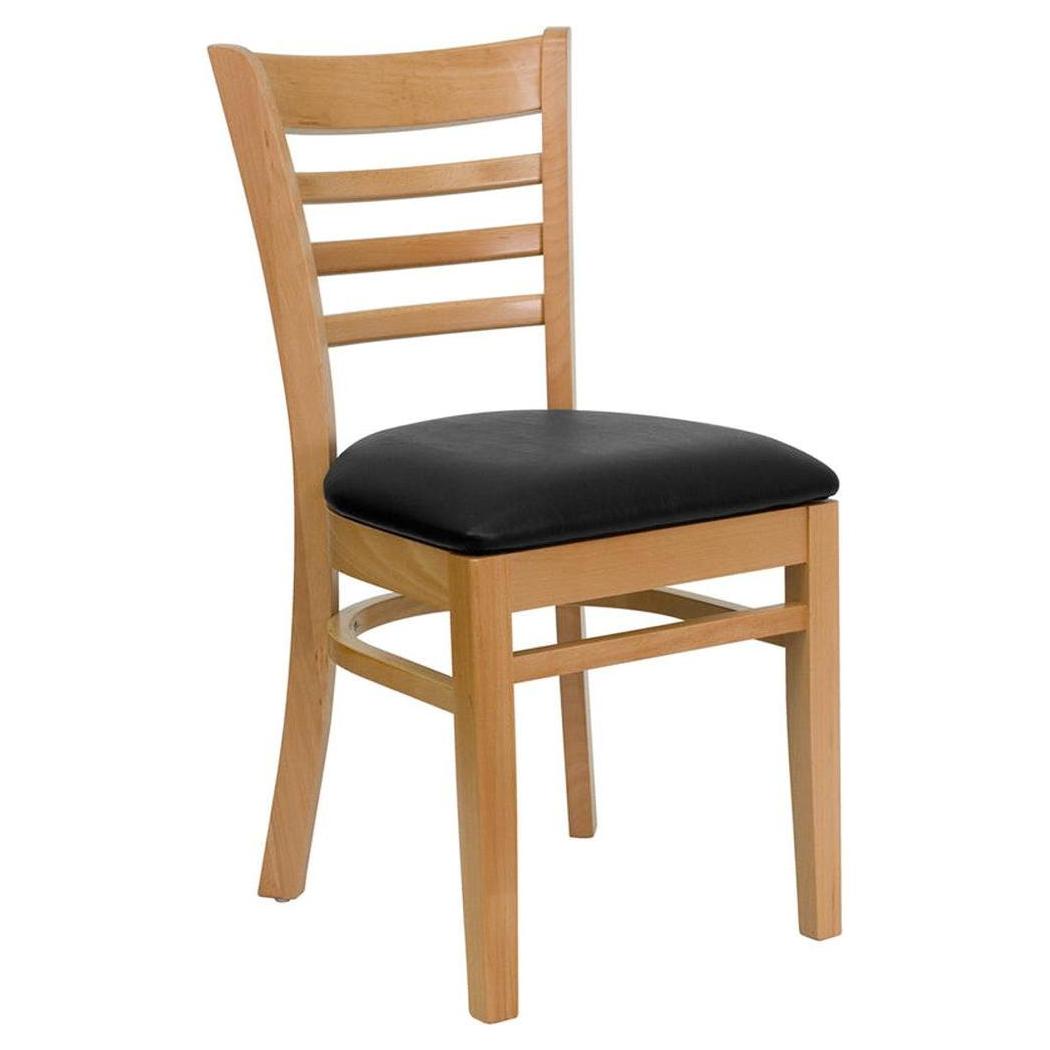 Create a first-rate dining experience by offering your patrons great food, service and attractive furnishings. This classic chair will offer guests a warm, inviting look when entering your establishment. This chair will make an attractive addition to your restaurant, lounge, bar or other high traffic venue. This chair is easy to clean, which is an important aspect when it comes to a business. This chair was designed to withstand the daily rigors in the hospitality industry, but will also provide a cozy, intimate quality to your home. The ladder back design and thickly padded, black vinyl upholstered seat will keep your guests comfortable. The durable frame is stabilized with mortise and tenon construction with metal wood screw reinforcements and a curved support bar for extra stability. The floor glides help protect your floors and ensure smooth gliding. This charmingly styled chair is a must have, whether used in the home or your commercial business.