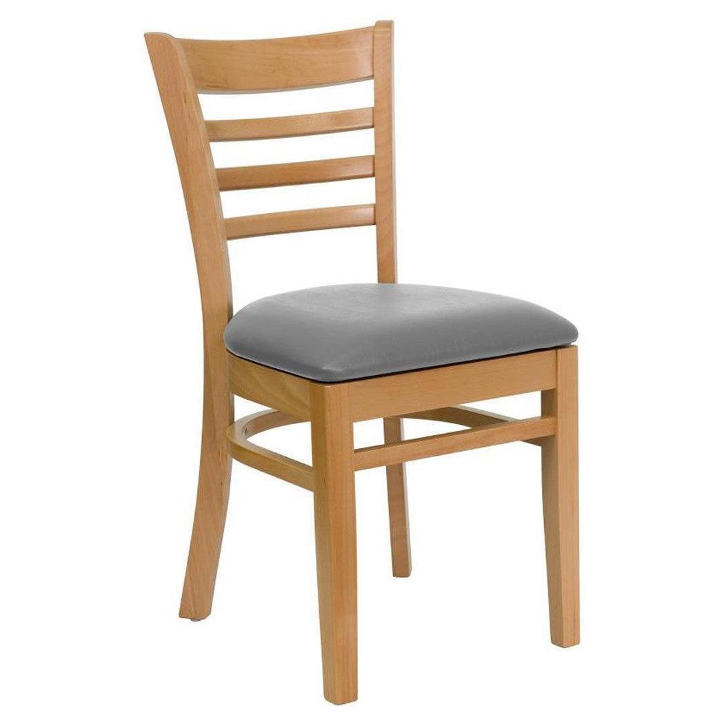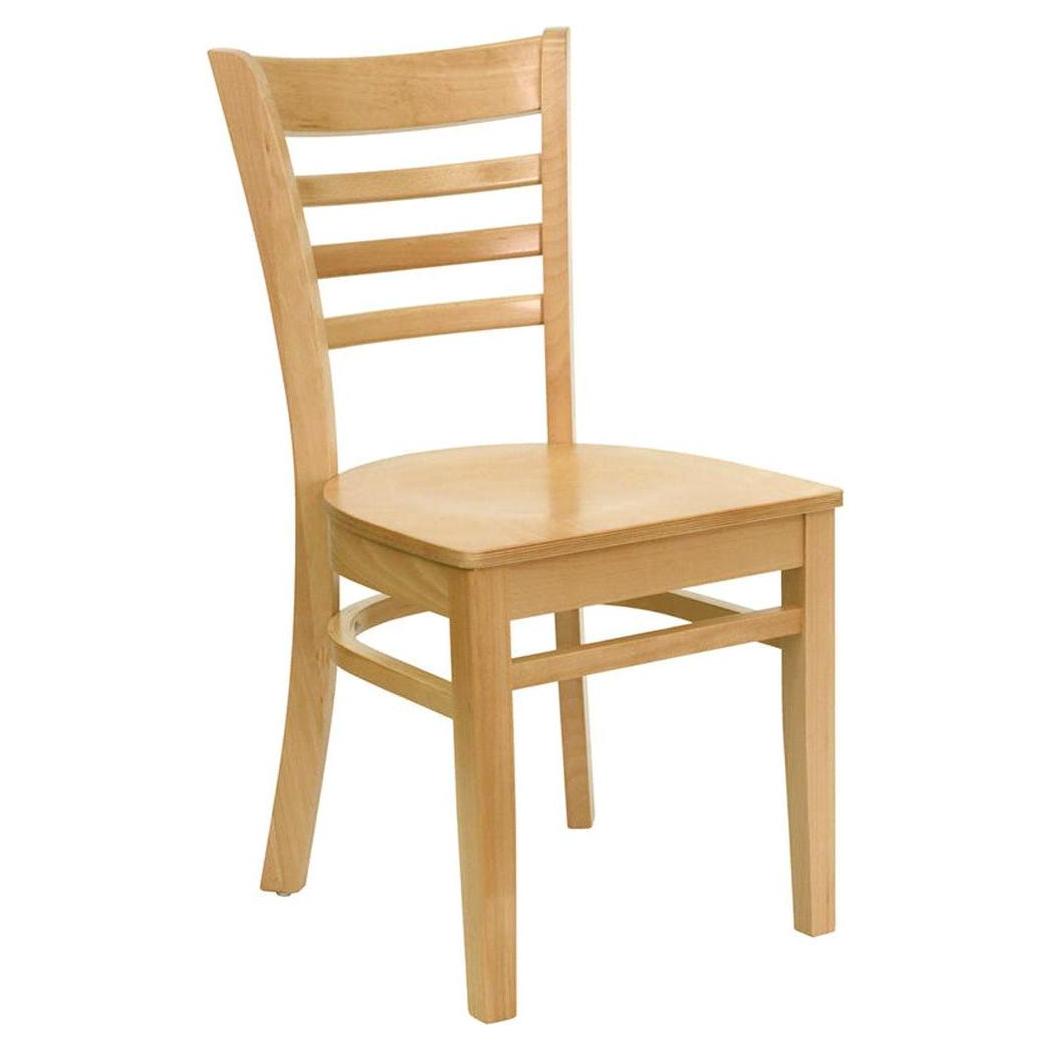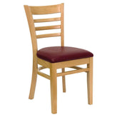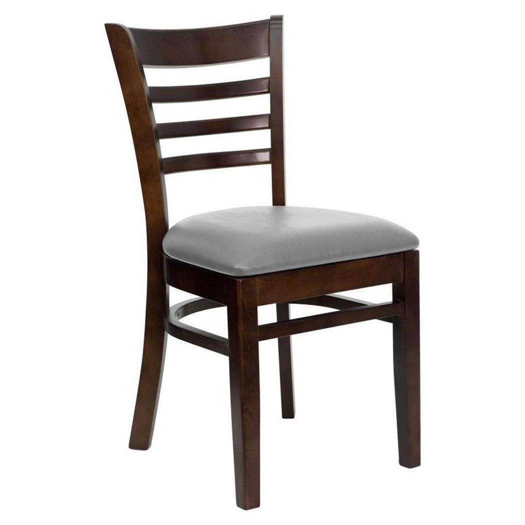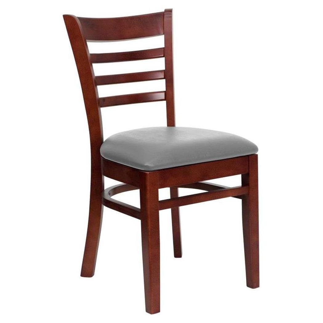 Create a first-rate dining experience by offering your patrons great food, service and attractive furnishings. This classic chair will offer guests a warm, inviting look when entering your establishment. This chair will make an attractive addition to your restaurant, lounge, bar or other high traffic venue. This chair is easy to clean, which is an important aspect when it comes to a business. This chair was designed to withstand the daily rigors in the hospitality industry, but will also provide a cozy, intimate quality to your home. The ladder back design and thickly padded, black vinyl upholstered seat will keep your guests comfortable. The durable frame is stabilized with mortise and tenon construction with metal wood screw reinforcements and a curved support bar for extra stability. The floor glides help protect your floors and ensure smooth gliding. This charmingly styled chair is a must have, whether used in the home or your commercial business.