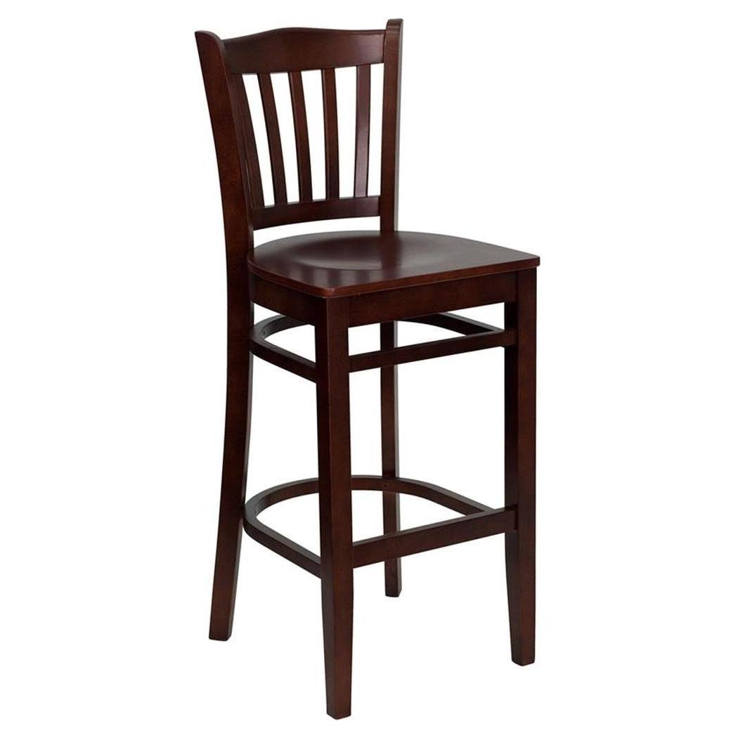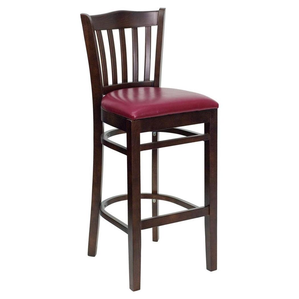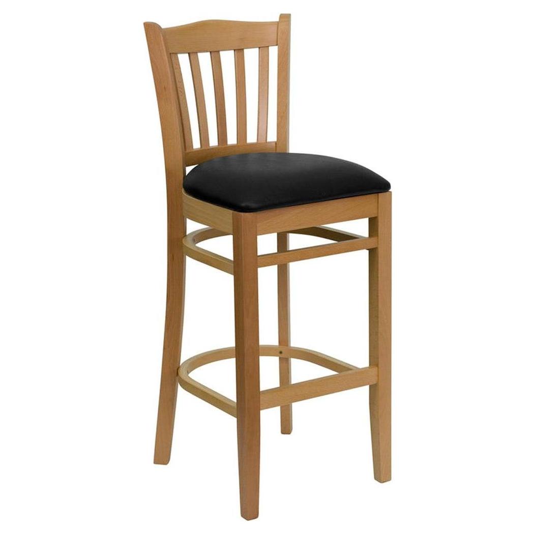 Create a first-rate dining experience by offering your patrons great food, service and attractive furnishings. This classic bar stool will offer guests a warm, inviting look when entering your establishment. This chair will make an attractive addition to your restaurant, pool hall, lounge, bar or other high traffic venue. This stool is easy to clean, which is an important aspect when it comes to a business. This barstool was designed to withstand the daily rigors in the hospitality industry, but will also provide a cozy, intimate quality to your home. The vertical slat back design and thickly padded, black vinyl upholstered seat will keep your guests comfortable. The durable frame is stabilized with mortise and tenon construction with metal wood screw reinforcements. Two curved support bars provide extra stability and include a footrest for improved posture. The floor glides help protect your floors and ensure smooth gliding. This charmingly styled chair is a must have, whether used in the home or your commercial business.