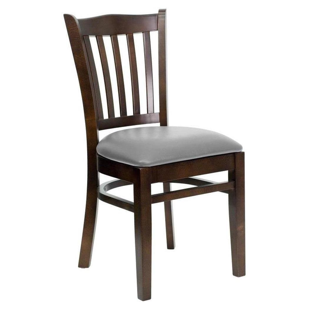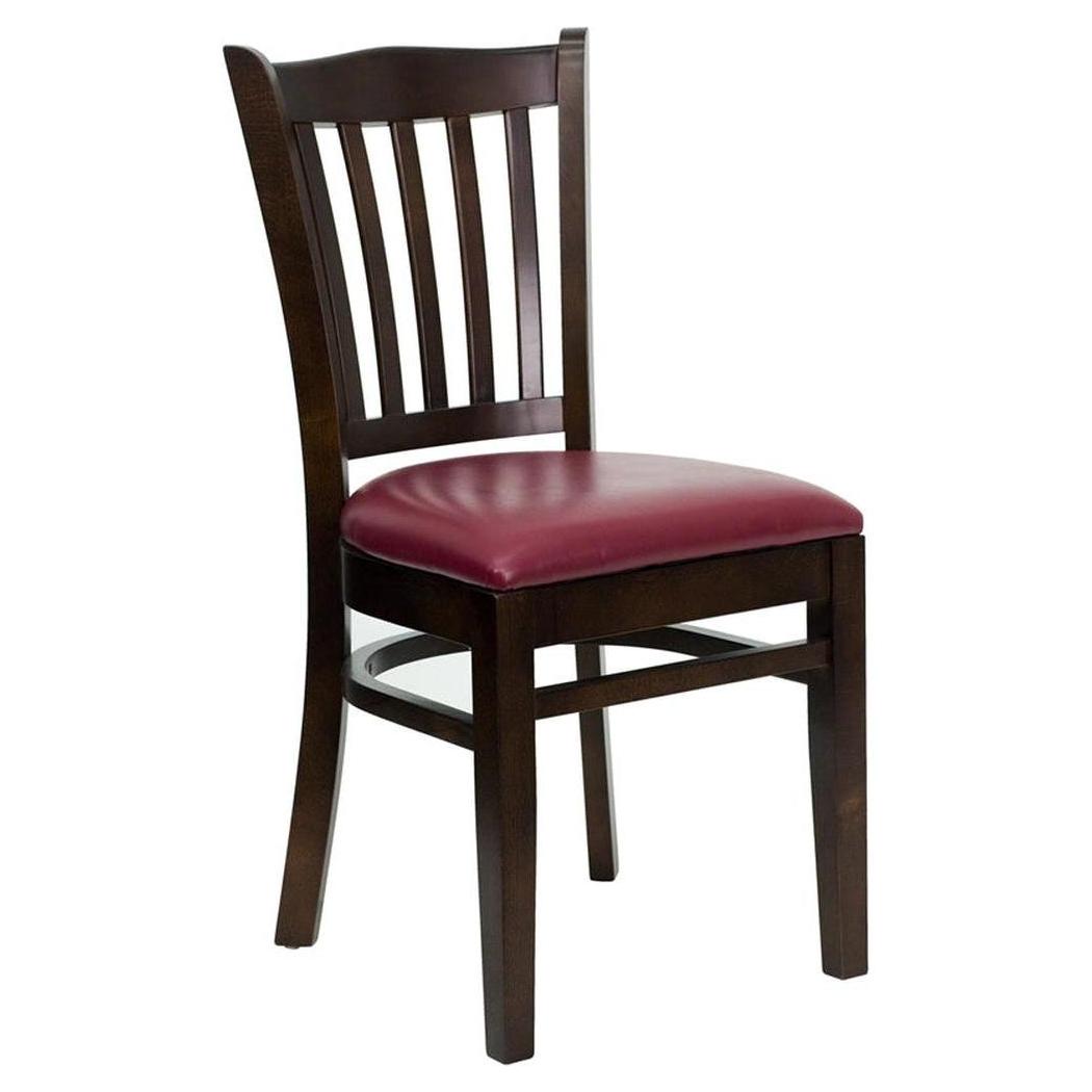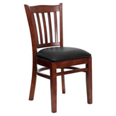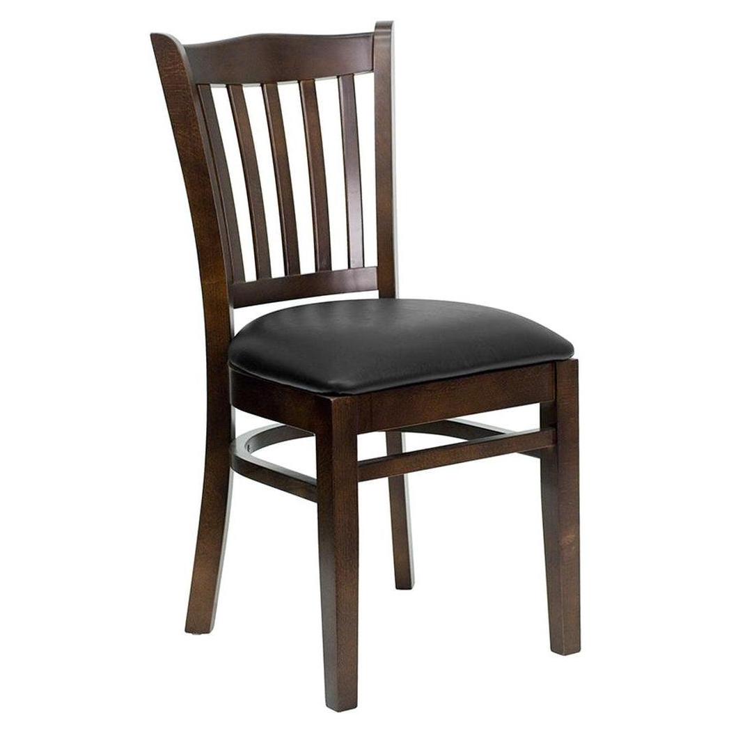 Create a first-rate dining experience by offering your patrons great food, service and attractive furnishings. This classic chair will offer guests a warm, inviting look when entering your establishment. This chair will make an attractive addition to your restaurant, lounge, bar or other high traffic venue. This chair is easy to clean, which is an important aspect when it comes to a business. This chair was designed to withstand the daily rigors in the hospitality industry, but will also provide a cozy, intimate quality to your home. The vertical slat back design and thickly padded, black vinyl upholstered seat will keep your guests comfortable. The durable frame is stabilized with mortise and tenon construction with metal wood screw reinforcements and a curved support bar for extra stability. The floor glides help protect your floors and ensure smooth gliding. This charmingly styled chair is a must have, whether used in the home or your commercial business.