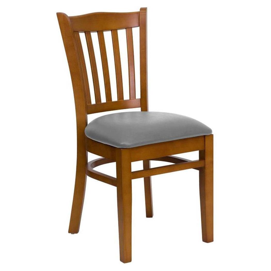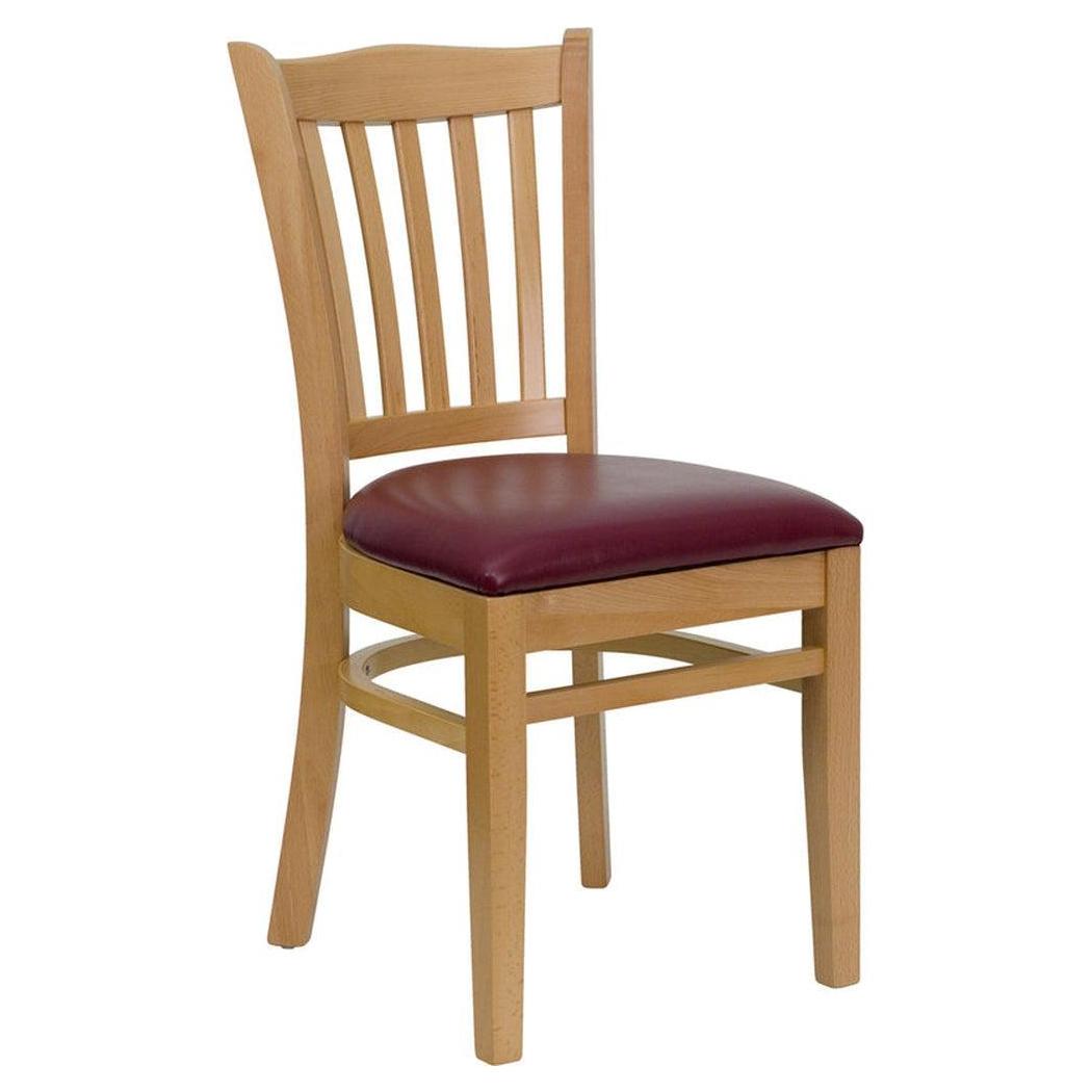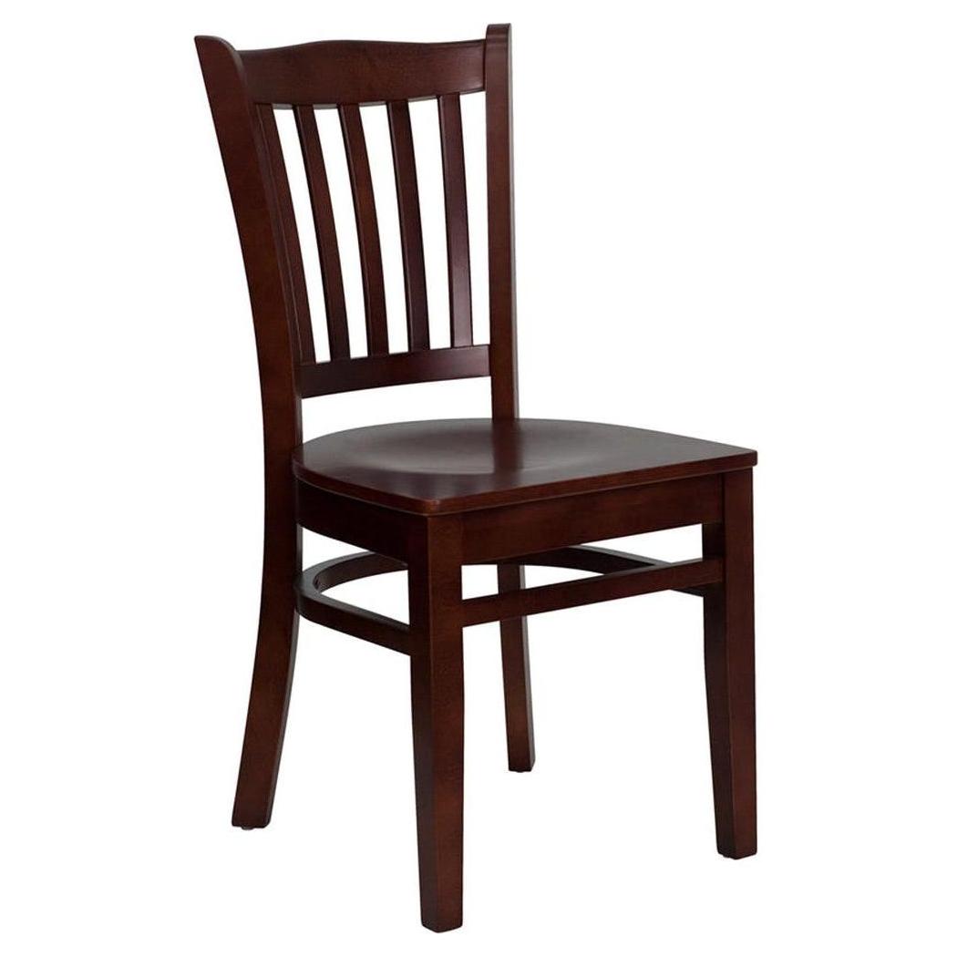 Create a first-rate dining experience by offering your patrons great food, service and attractive furnishings. This classic chair will offer guests a warm, inviting look when entering your establishment. This chair will make an attractive addition to your restaurant, lounge, bar or other high traffic venue. This chair is easy to clean, which is an important aspect when it comes to a business. This chair was designed to withstand the daily rigors in the hospitality industry, but will also provide a cozy, intimate quality to your home. The vertical slat back design and thickly padded, black vinyl upholstered seat will keep your guests comfortable. The durable frame is stabilized with mortise and tenon construction with metal wood screw reinforcements and a curved support bar for extra stability. The floor glides help protect your floors and ensure smooth gliding. This charmingly styled chair is a must have, whether used in the home or your commercial business.