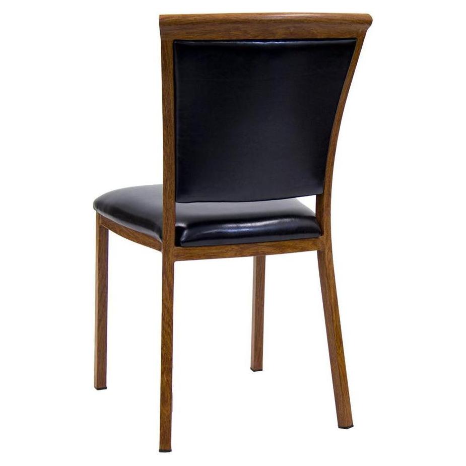 Indoor Wood Grain Metal Chair in Walnut Finish with Black Vinyl Seat and Back.