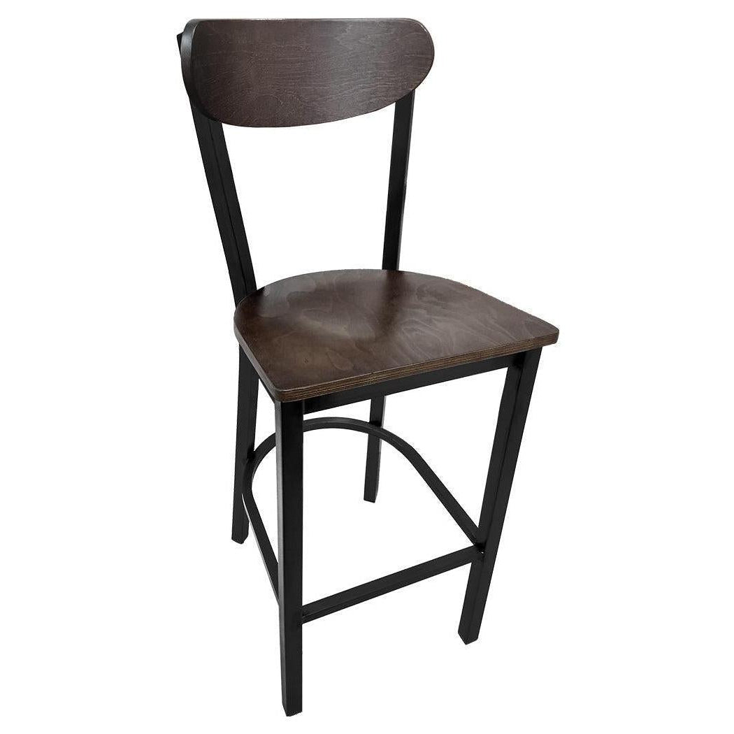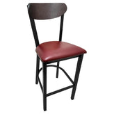 Kidney Wood Back Bar Stool with Black Metal Frame. Available in Driftwood or Walnut stained wood back with a wood or upholstered seat.