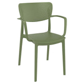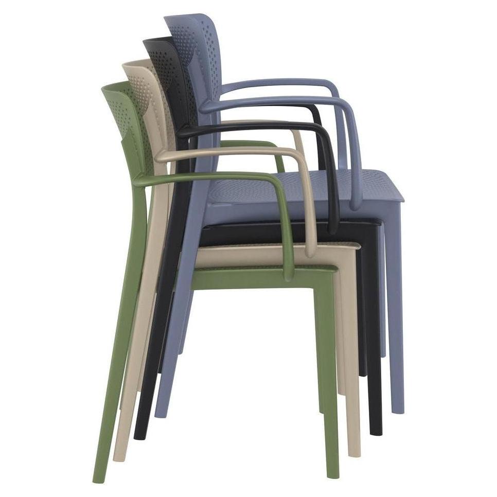 Loft resin indoor - outdoor dining arm chair. New transitional design combined with commercial strength. Can be used in modern or traditional settings indoor or outdoor. Made from marine grade resin with gas injection molded legs. Pinhole seat and back. Perfect for heavy use areas. Preferred by restaurants, cafes, food-courts, hospitals and hotels. Chairs are stackable. Certified for strict European standards by CATAS Italian research institute and test laboratory.