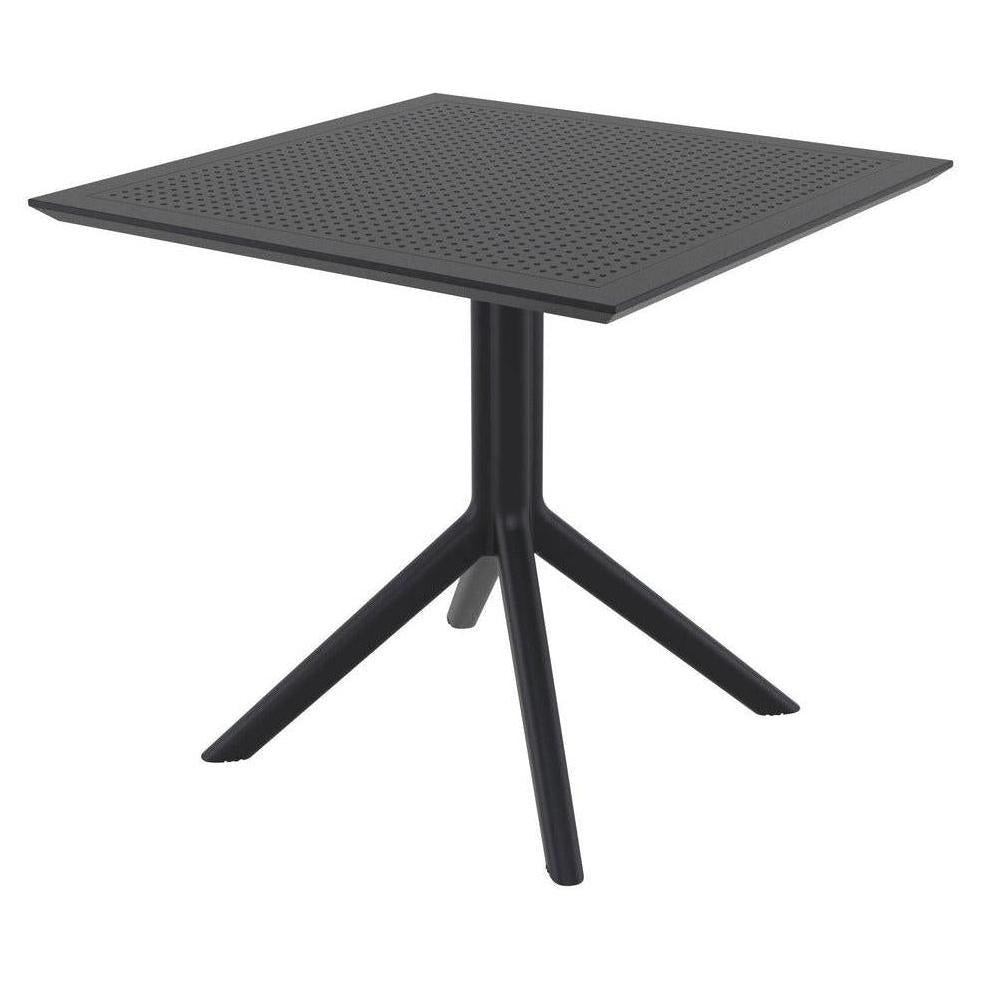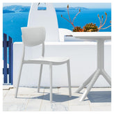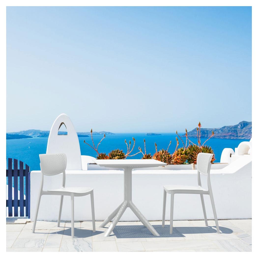 Lucy outdoor bistro set with two dining chairs and one square table. Contemporary design. Made from commercial grade resin with gas injection molded legs. Extremely durable for outdoor temperatures. Easy cleaning. Perfect for heavy use indoor outdoor areas. High quality commercial grade resin furniture - featuring refined designs, that are weatherproof, comfortable, and functional. Preferred for heavy use areas, pool sides, patios, beach and balcony use. Items are resistant to UV, salt, weather, sun tanning oils. |