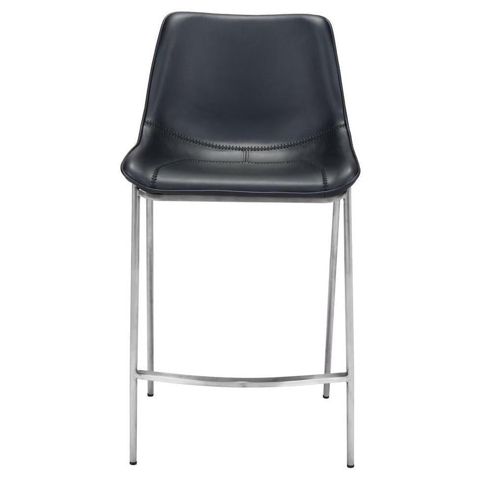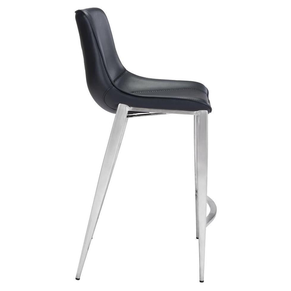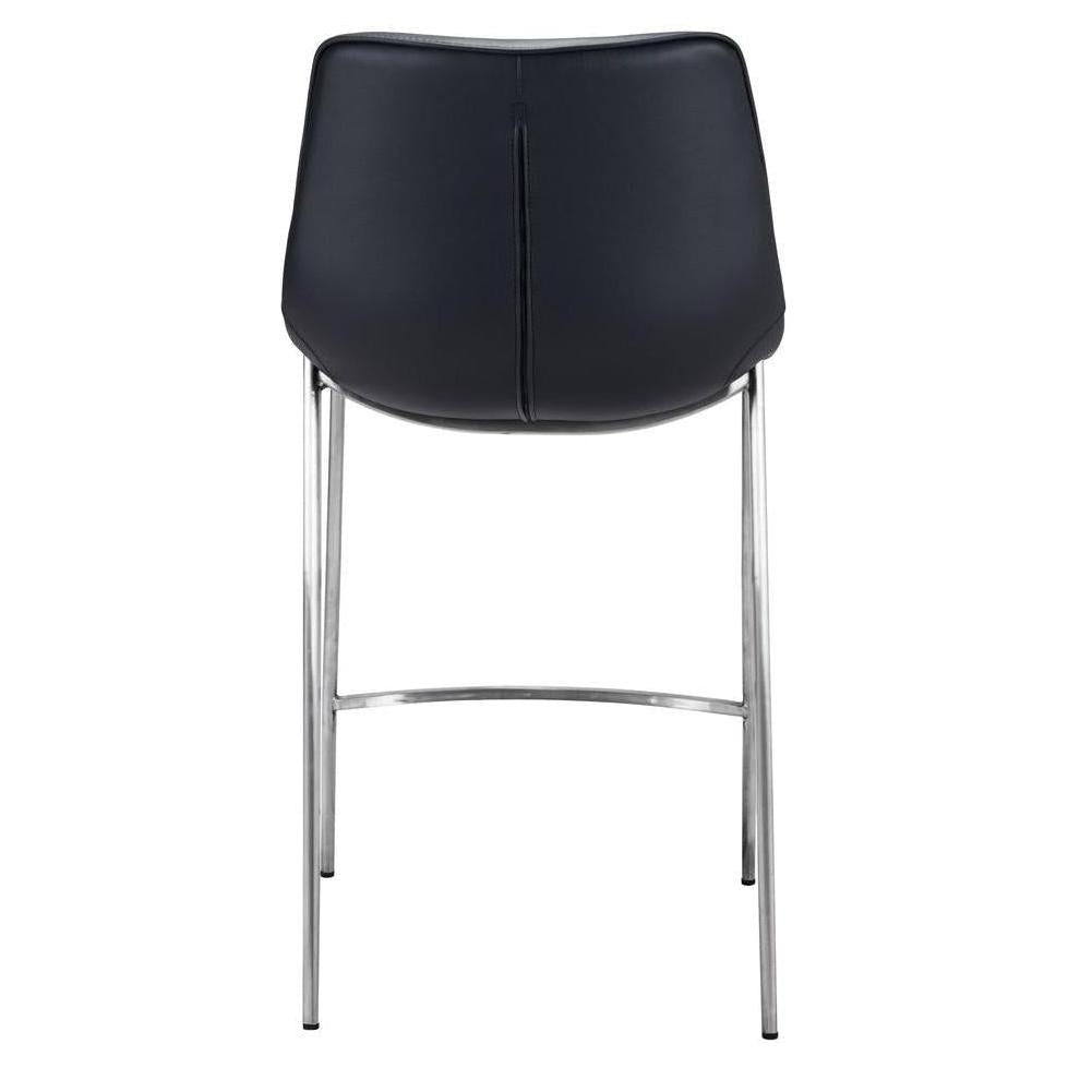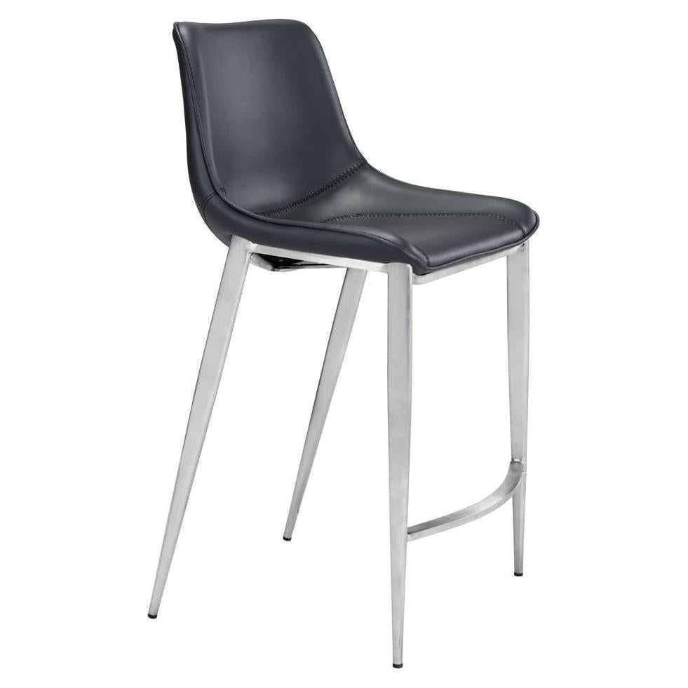 High design meets everyday casual. This handsome counter chair with its slim profile pulls up perfectly to the bar. Its super comfortable curved seat is covered in black faux leather with dramatic stitching. Brushed stainless steel legs are complete with protective plastic feet to keep your floors scratch-free. |
