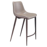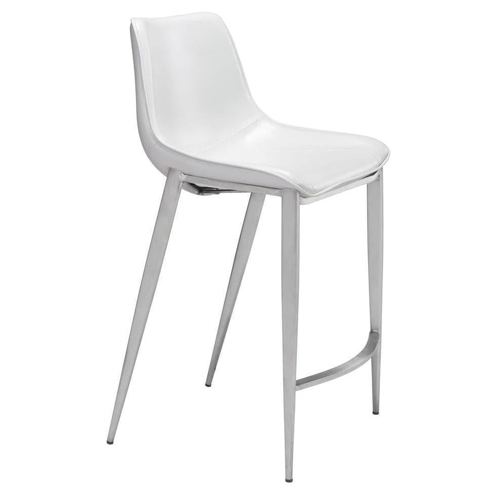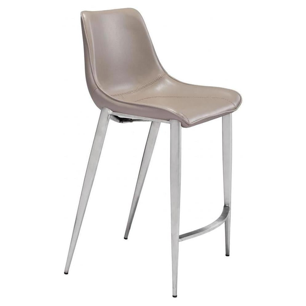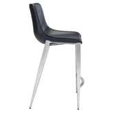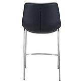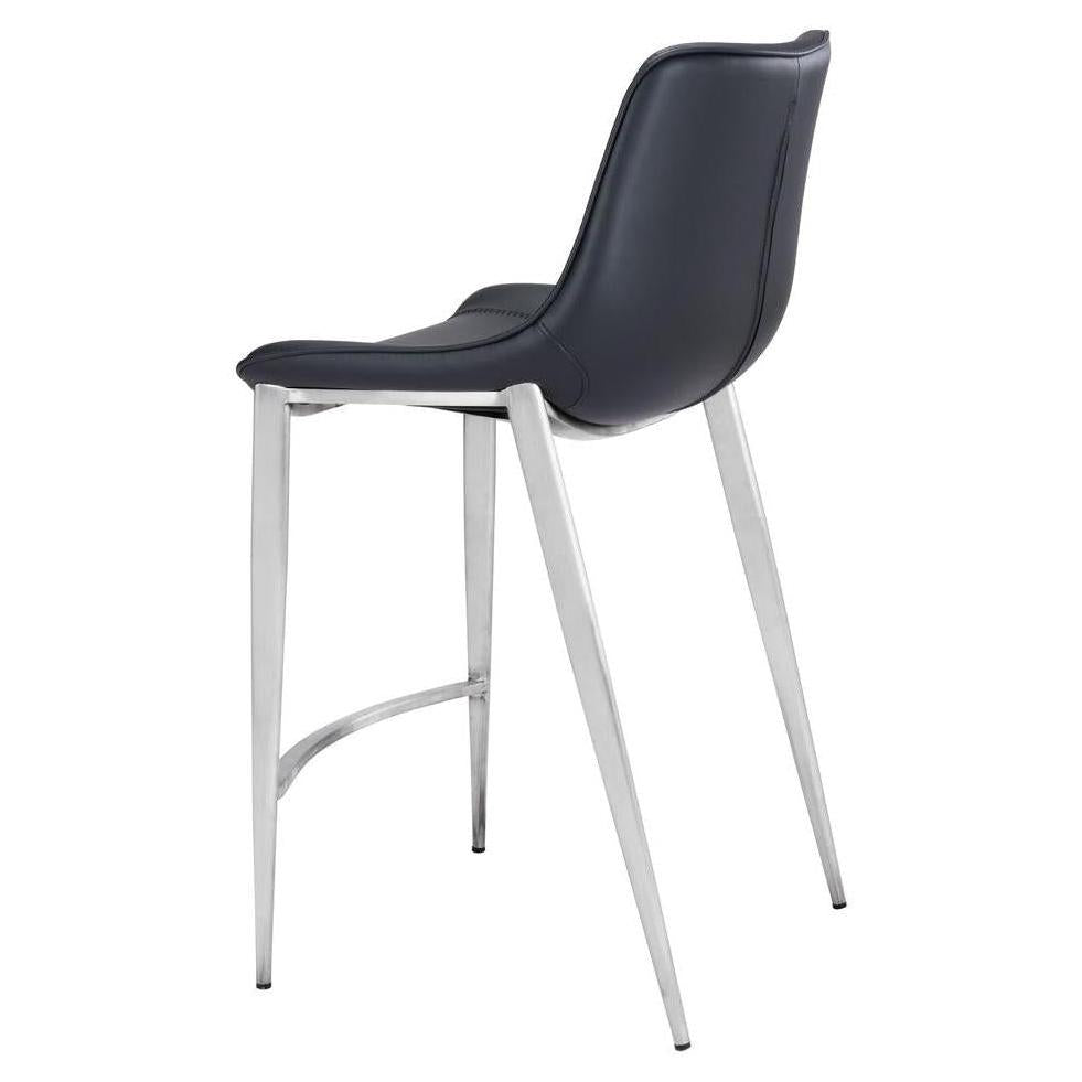 High design meets everyday casual. This handsome counter chair with its slim profile pulls up perfectly to the bar. Its super comfortable curved seat is covered in black faux leather with dramatic stitching. Brushed stainless steel legs are complete with protective plastic feet to keep your floors scratch-free. |
