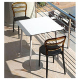 Maya dining table. MDF laminated top with the latest generation of air moulding thermoplastic legs. For indoor and outdoor use in shaded areas. Can be disassembled. Not recommended in direct sunlight.