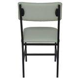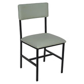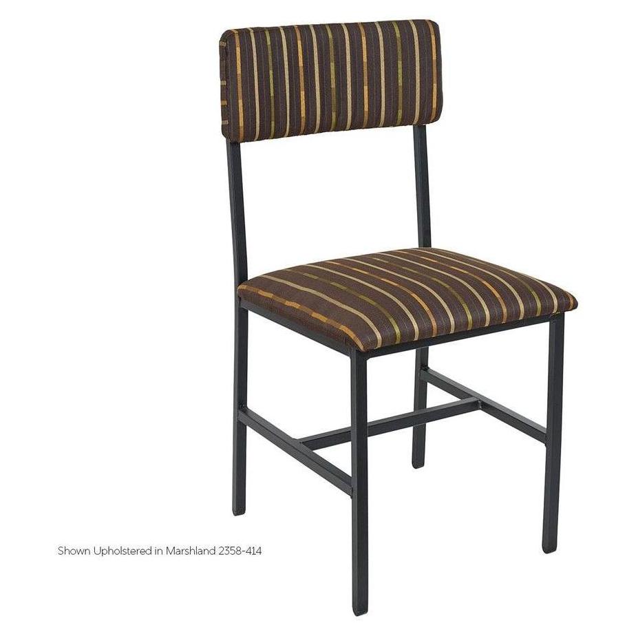 This modern Meghan Upholstered Side Chair features an industrial design. It is available in sand black powder coat finish. It has an upholstered seat and back. Upgraded upholstery options available. It comes with a one-year manufacturer's warranty and our best price guarantee.