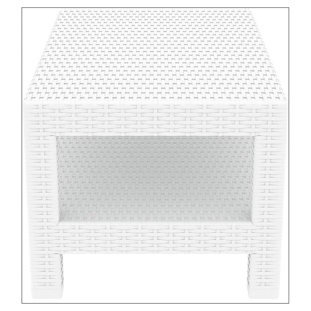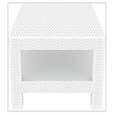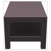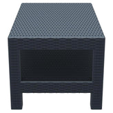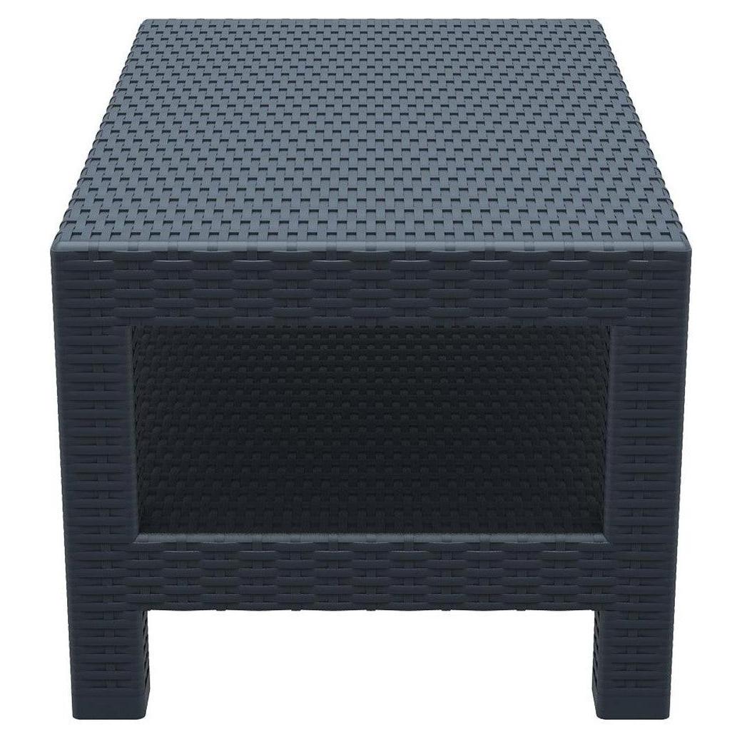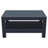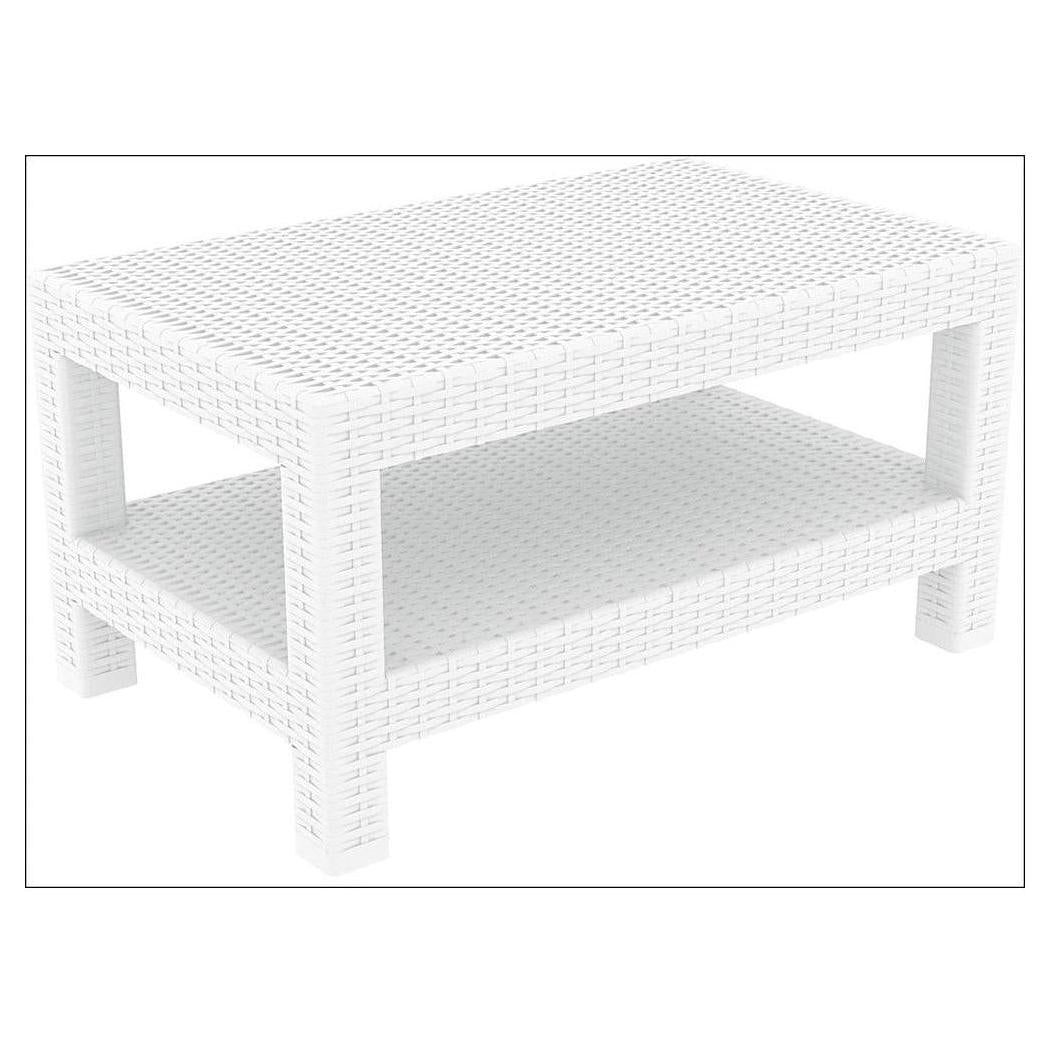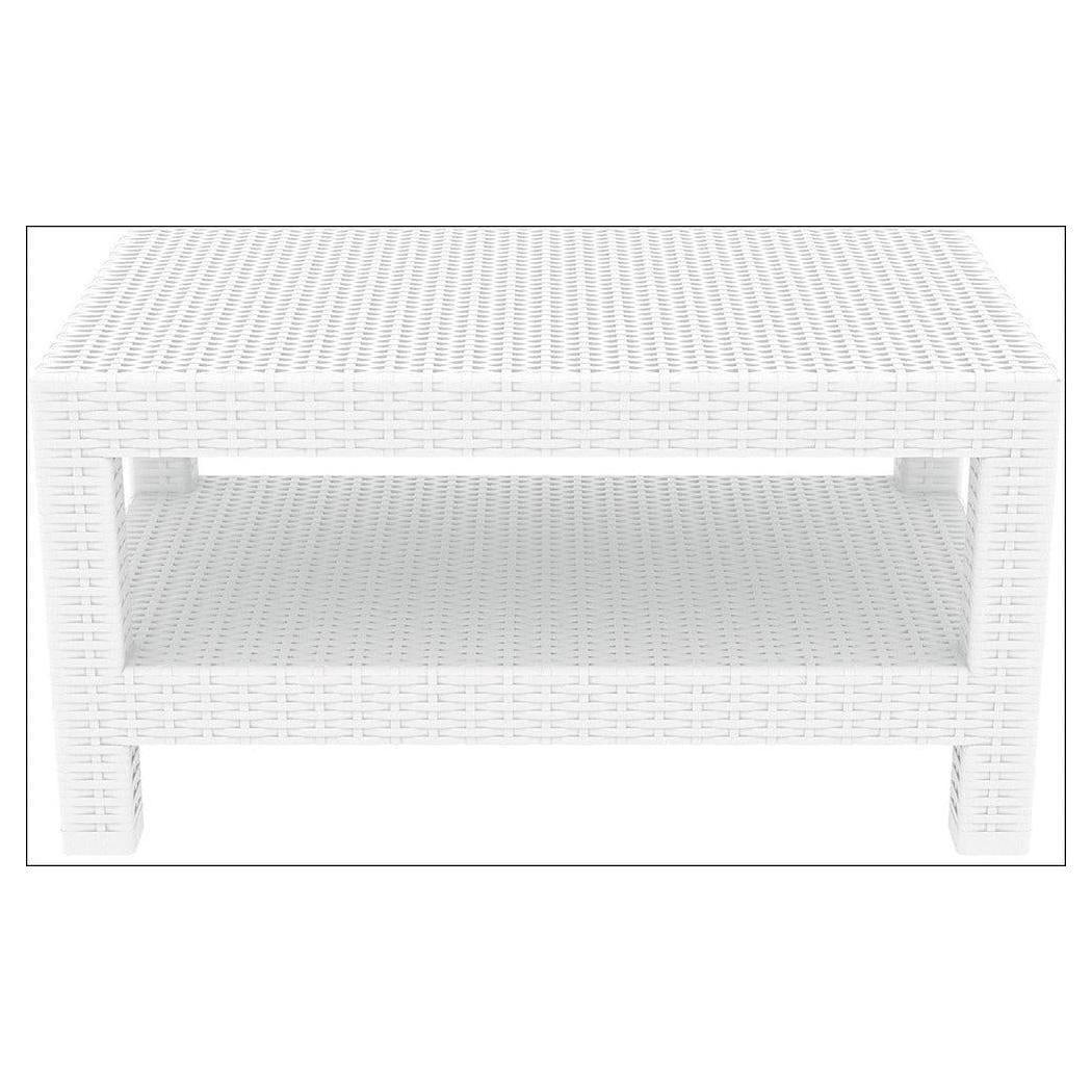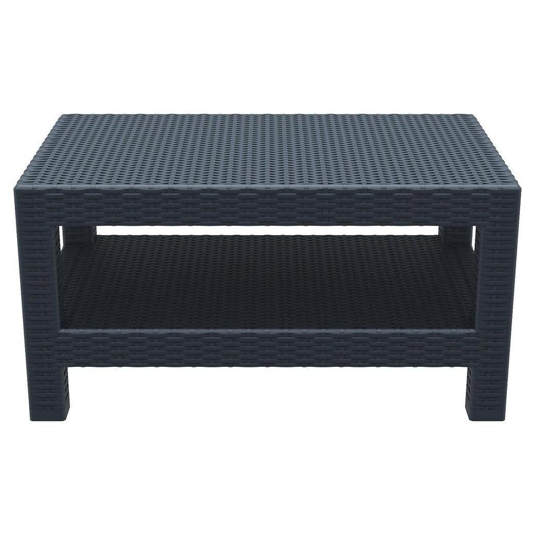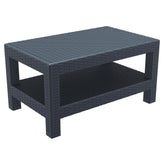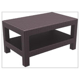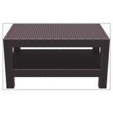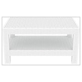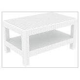 Monaco rectangle coffee table. Wickerlook design resembles traditional woven wicker furniture. Will never unravel. Made for commercial durability. Perfect for hotels and restaurants. UV treated. Hose down for cleaning. No metal parts to rust, no moving parts that can break. Made for outdoors. Assembly required. Table has a magazine shelf. |