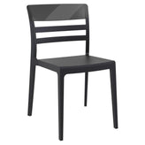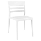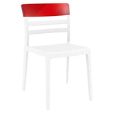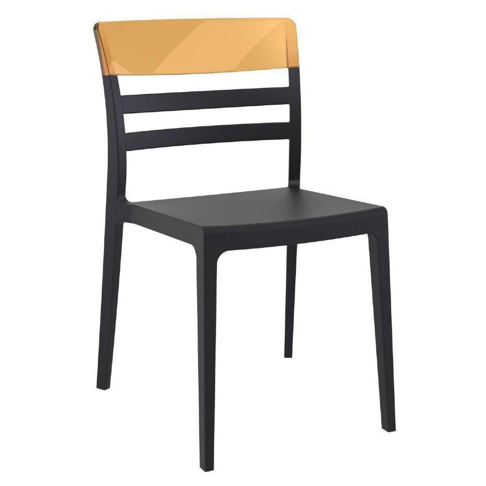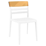 Moon stacking indoor outdoor dining chair. New addition to our hybrid chairs. Moon chair is made with polypropylene construction and a polycarbonate back accent. Chair legs are reinforced with fiberglass. Commercial grade chairs can be used indoors or outdoors. Chairs are maintenance free. Available in multiple color combinations. Modern minimalist design.