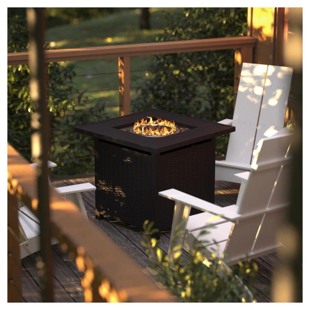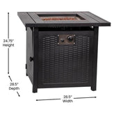Olympia 28" Square 50,000 BTU Outdoor Propane Gas Fire Pit Table with Stainless Steel Tabletop, Lid, Lava Rocks, and Steel Wicker Detail Base - Black