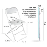 These plastic (poly) folding chairs with steel frames are the value leader in the folding chair category. It's simple and beautiful design works for all types of events. The low price allows you to accommodate the largest events with ease. The poly folding chair has been the event industry's work horse for decades. Its sleek and light weight design is great for all events, stacking easily for storage and transportation. Maintenance is simple with the poly folding chair...just wipe and go.