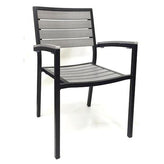 Enhance your outdoor dining space with this durable, foodservice-grade armchair designed to handle the demands of busy restaurants, cafés, and patios. Built with a sturdy black metal frame and synthetic gray teak slats, this chair combines the warmth of wood with the durability of weather-resistant materials.