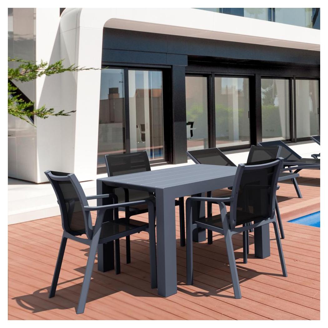 Pacific resort quality dining set with four sling arm chairs and an extension table. Simple sleek design with commercial strength. Sling is made with Serge Ferrari mesh fabric. Chair is very comfortable and no need for cushions. Stacks for easy storage. Frame made of marine grade resin polypropylene. Extremely durable and comfortable. Commercial grade.