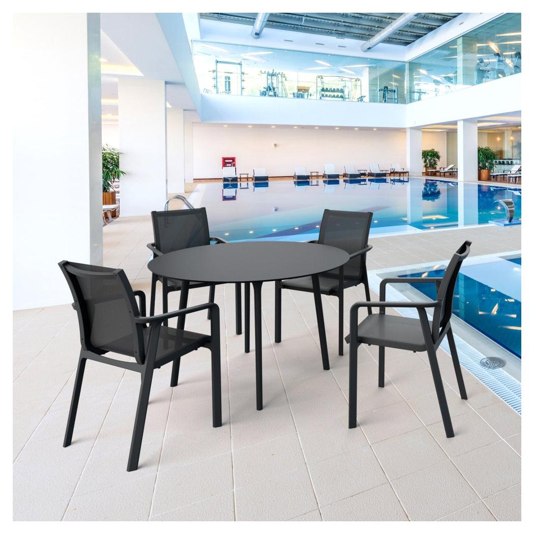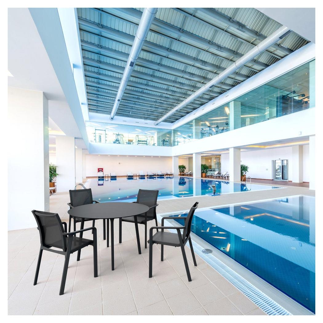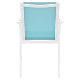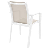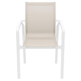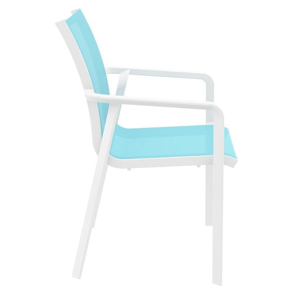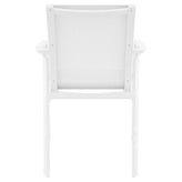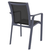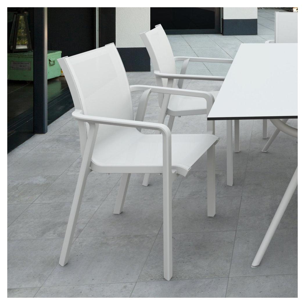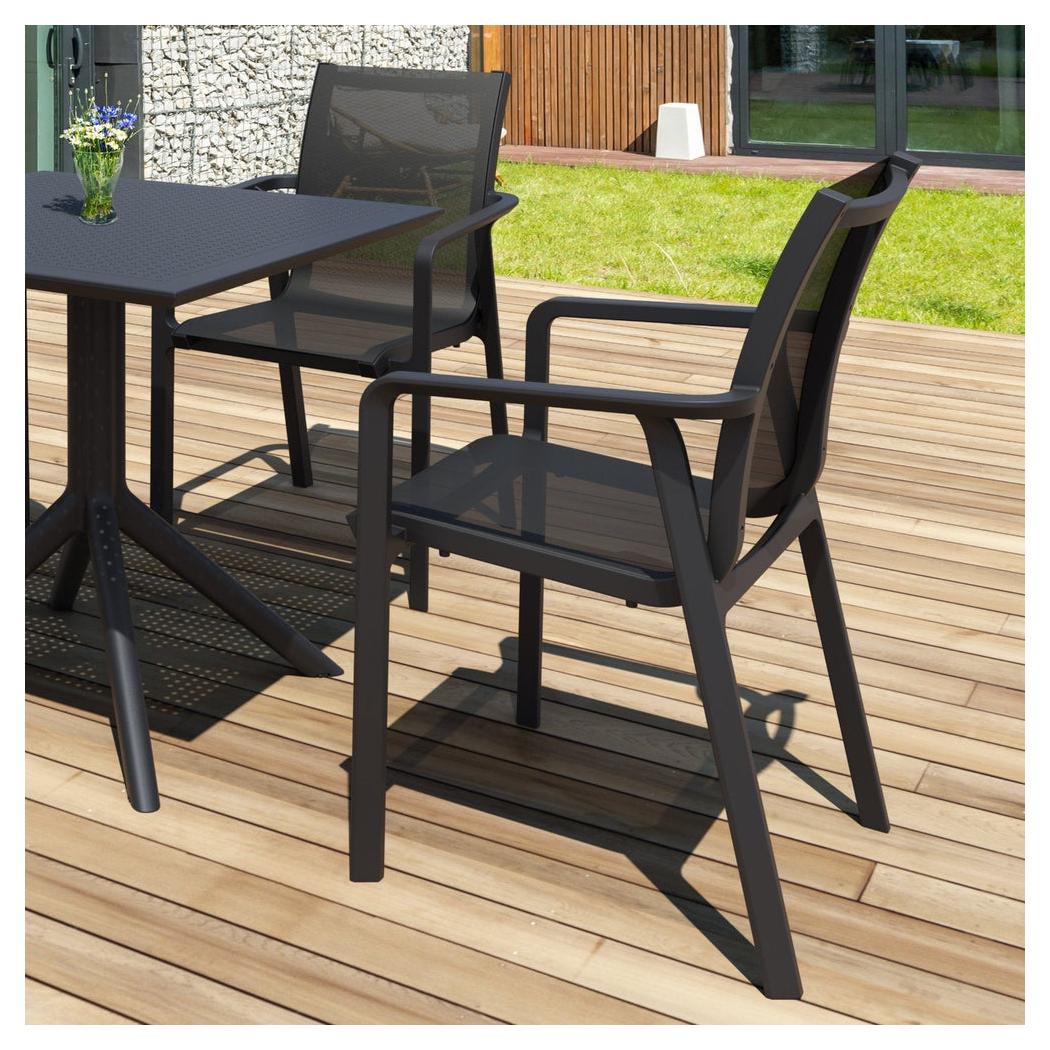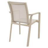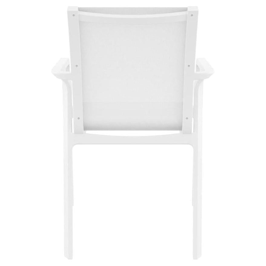 Must be ordered in quantities of 2. Price listed is per item price. Pacific resort quality dining arm chair. Simple sleek design with commercial strength. Sling is made with Serge Ferrari mesh fabric. Chair is very comfortable and no need for cushions. Stacks for easy storage. Frame made of marine grade resin polypropylene. Extremely durable and comfortable. Commercial grade. High quality commercial grade resin furniture - featuring refined designs, that are weatherproof, comfortable, and functional. Preferred for heavy use areas, pool sides, patios, beach and balcony use. Items are resistant to UV, salt, weather, sun tanning oils.