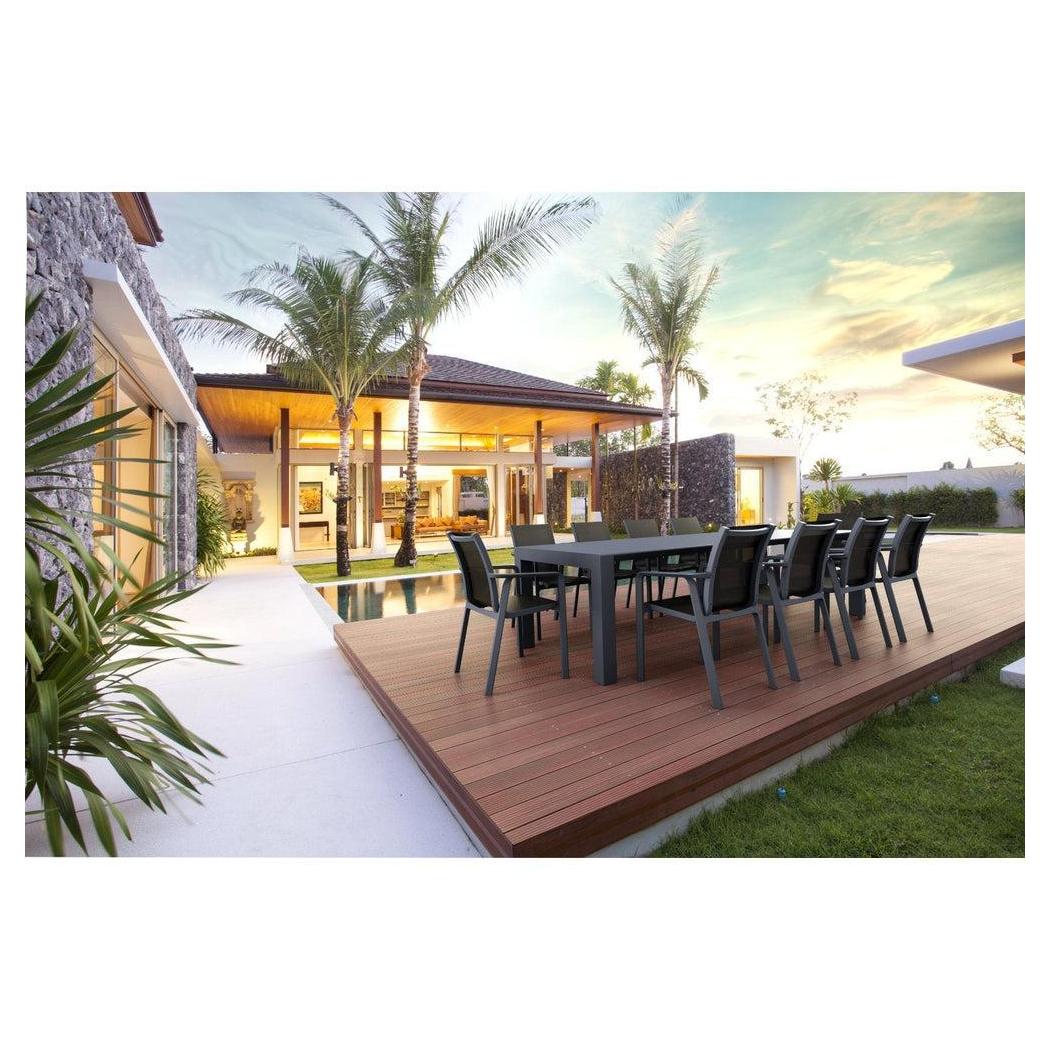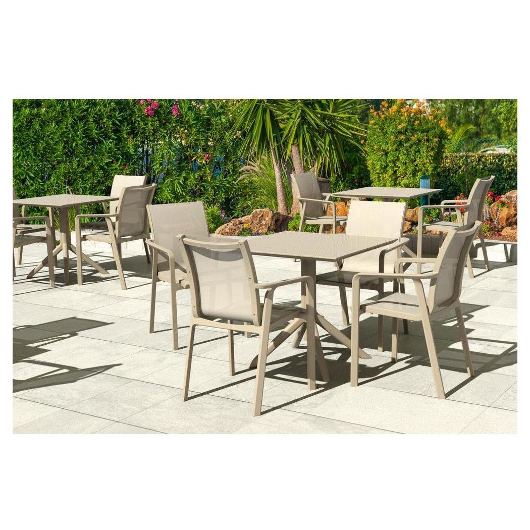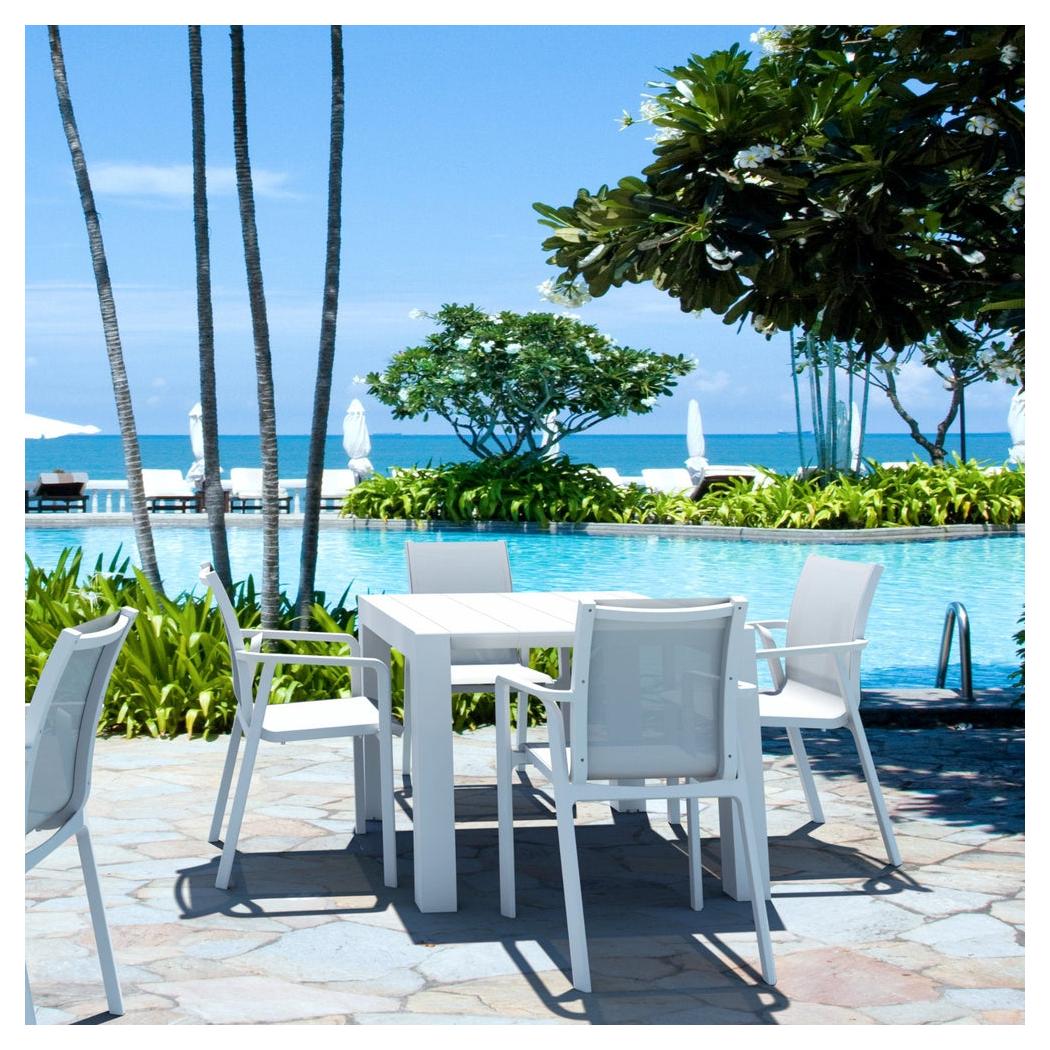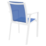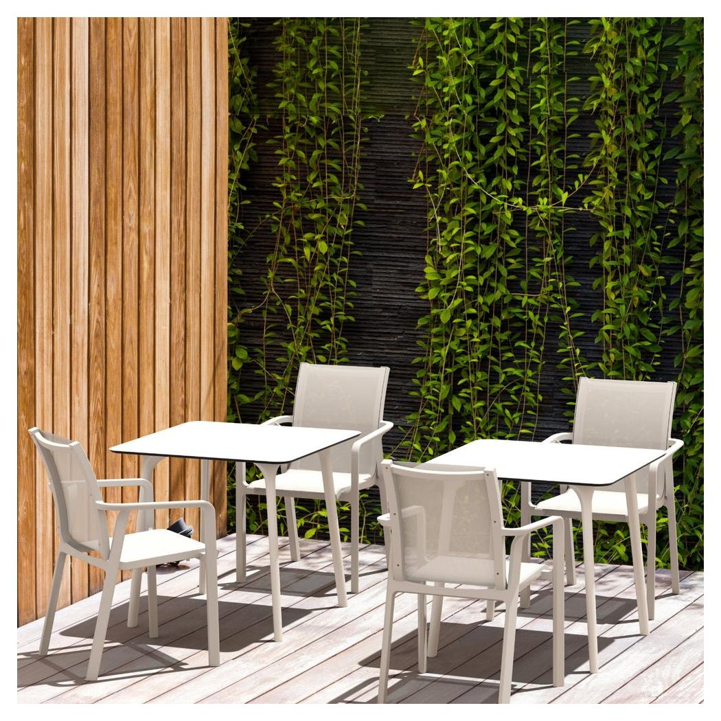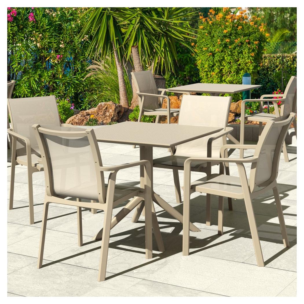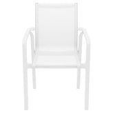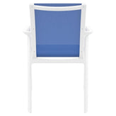 Must be ordered in quantities of 2. Price listed is per item price. Pacific resort quality dining arm chair. Simple sleek design with commercial strength. Sling is made with Serge Ferrari mesh fabric. Chair is very comfortable and no need for cushions. Stacks for easy storage. Frame made of marine grade resin polypropylene. Extremely durable and comfortable. Commercial grade. High quality commercial grade resin furniture - featuring refined designs, that are weatherproof, comfortable, and functional. Preferred for heavy use areas, pool sides, patios, beach and balcony use. Items are resistant to UV, salt, weather, sun tanning oils.